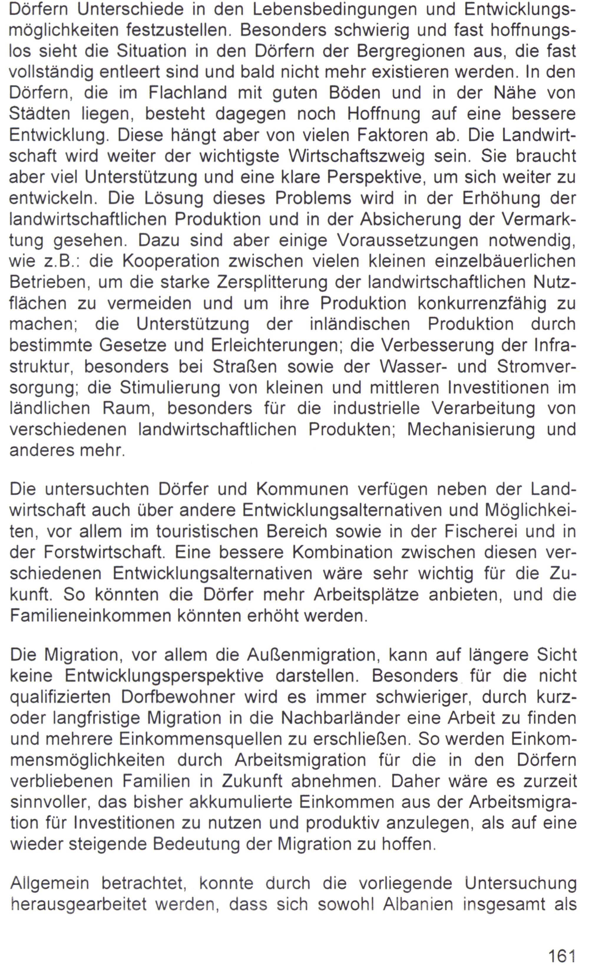 Dörfern Unterschiede in den Lebensbedingungen und Entwicklungsmöglichkeiten festzustellen. Besonders schwierig und fast hoffnungslos sieht die Situation in den Dörfern der Bergregionen aus, die fast vollständig entleert sind und bald nicht mehr existieren werden. In den Dörfern, die im Flachland mit guten Böden und in der Nähe von Städten liegen, besteht dagegen noch Hoffnung auf eine bessere Entwicklung. Diese hängt aber von vielen Faktoren ab. Die Landwirtschaft wird weiter der wichtigste Wirtschaftszweig sein. Sie braucht aber viel Unterstützung und eine klare Perspektive, um sich weiter zu entwickeln. Die Lösung dieses Problems wird in der Erhöhung der landwirtschaftlichen Produktion und in der Absicherung der Vermarktung gesehen. Dazu sind aber einige Voraussetzungen notwendig, wie z.B.: die Kooperation zwischen vielen kleinen einzelbäuerlichen Betrieben, um die starke Zersplitterung der landwirtschaftlichen Nutzflächen zu vermeiden und um ihre Produktion konkurrenzfähig zu machen; die Unterstützung der inländischen Produktion durch bestimmte Gesetze und Erleichterungen; die Verbesserung der Infrastruktur, besonders bei Straßen sowie der Wasser- und Stromversorgung; die Stimulierung von kleinen und mittleren Investitionen im ländlichen Raum, besonders für die industrielle Verarbeitung von verschiedenen landwirtschaftlichen Produkten; Mechanisierung und anderes mehr.