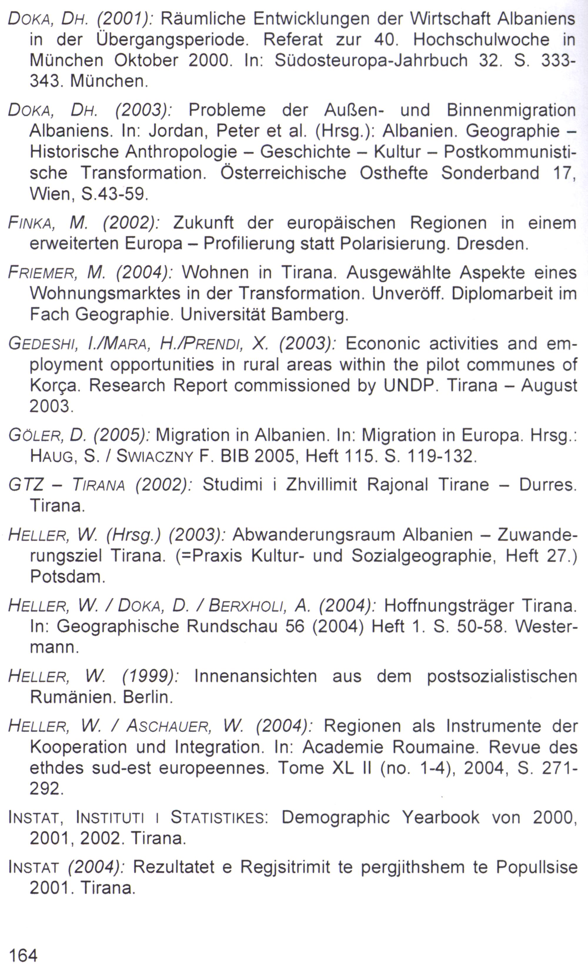 DokA, Dr.(2001): Räumliche Entwicklungen der Wirtschaft Albaniens in der Übergangsperiode. Referat zur 40. Hochschulwoche in München Oktober 2000. In: Südosteuropa-Jahrbuch 32. S. 333343. München.