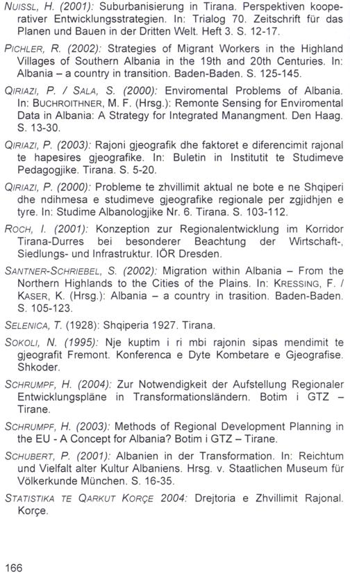 SANTNER-SCHRIEBEL, S.(2002): Migration within Albania— From the Northern Highlands to the Cities of the Plains. In: KRESSING, F./ KASER, K.(Hrsg.): Albania—- a country in trasition. Baden-Baden. S. 105-123.