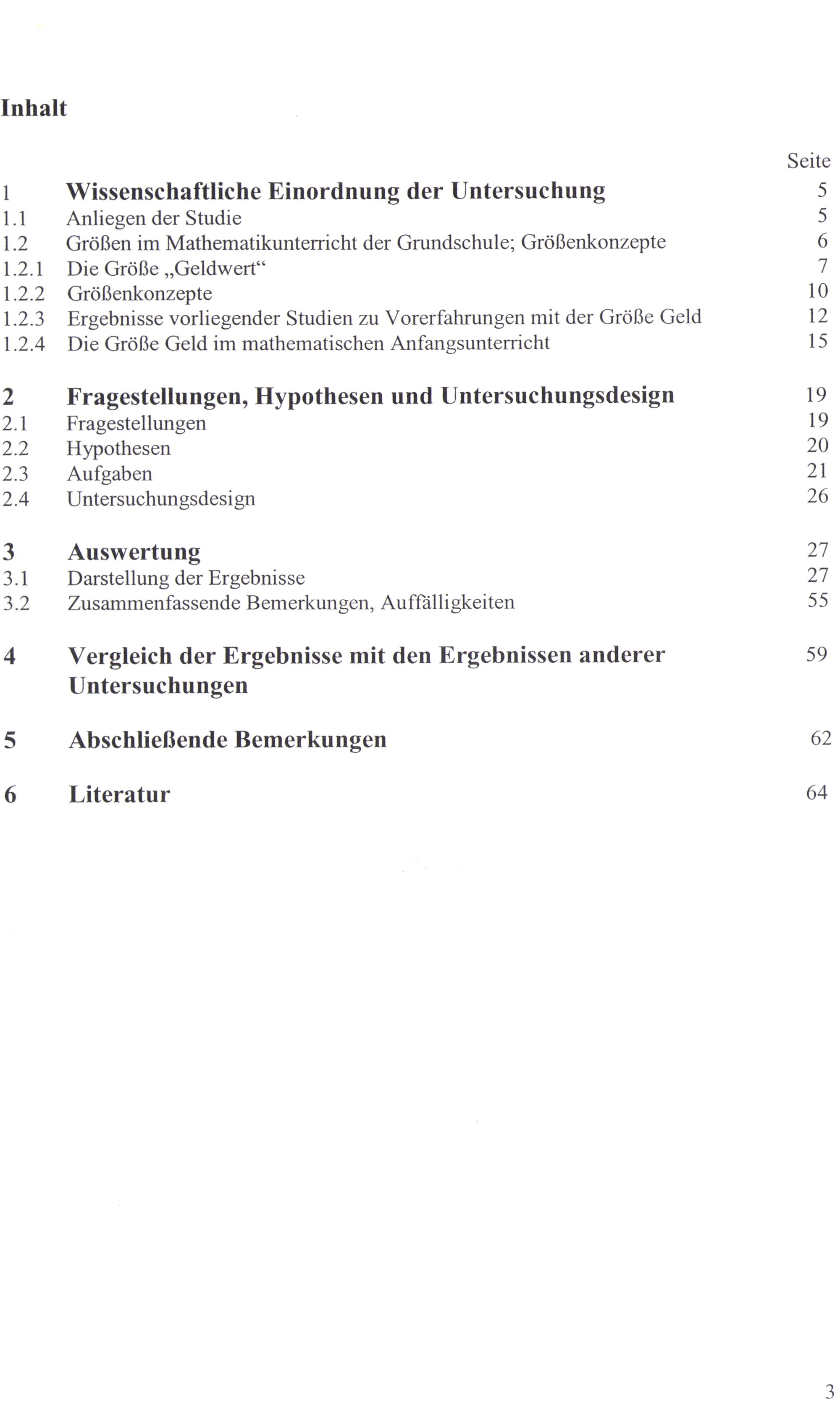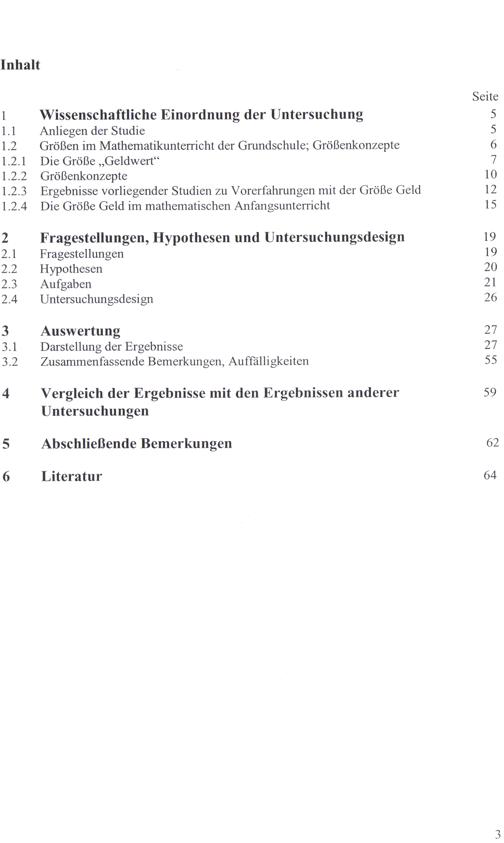 Seite 1 Wissenschaftliche Einordnung der Untersuchung 5 1.1 Anliegen der Studie 5 1.2. Größen im Mathematikunterricht der Grundschule; Größenkonzepte 6 1.2.1 Die Größe„Geldwert“ 7 1.2.2 Größenkonzepte 10 1.2.3 Ergebnisse vorliegender Studien zu Vorerfahrungen mit der Größe Geld 12 1.2.4 Die Größe Geld im mathematischen Anfangsunterricht 15 2 Fragestellungen, Hypothesen und Untersuchungsdesign 19 2.1 Fragestellungen 19 2.2 Hypothesen 20 2.3 Aufgaben 21 2.4 Untersuchungsdesign 26 3 Auswertung 27 3.1 Darstellung der Ergebnisse 27 3.2 Zusammenfassende Bemerkungen, Auffälligkeiten 55 4 Vergleich der Ergebnisse mit den Ergebnissen anderer 59