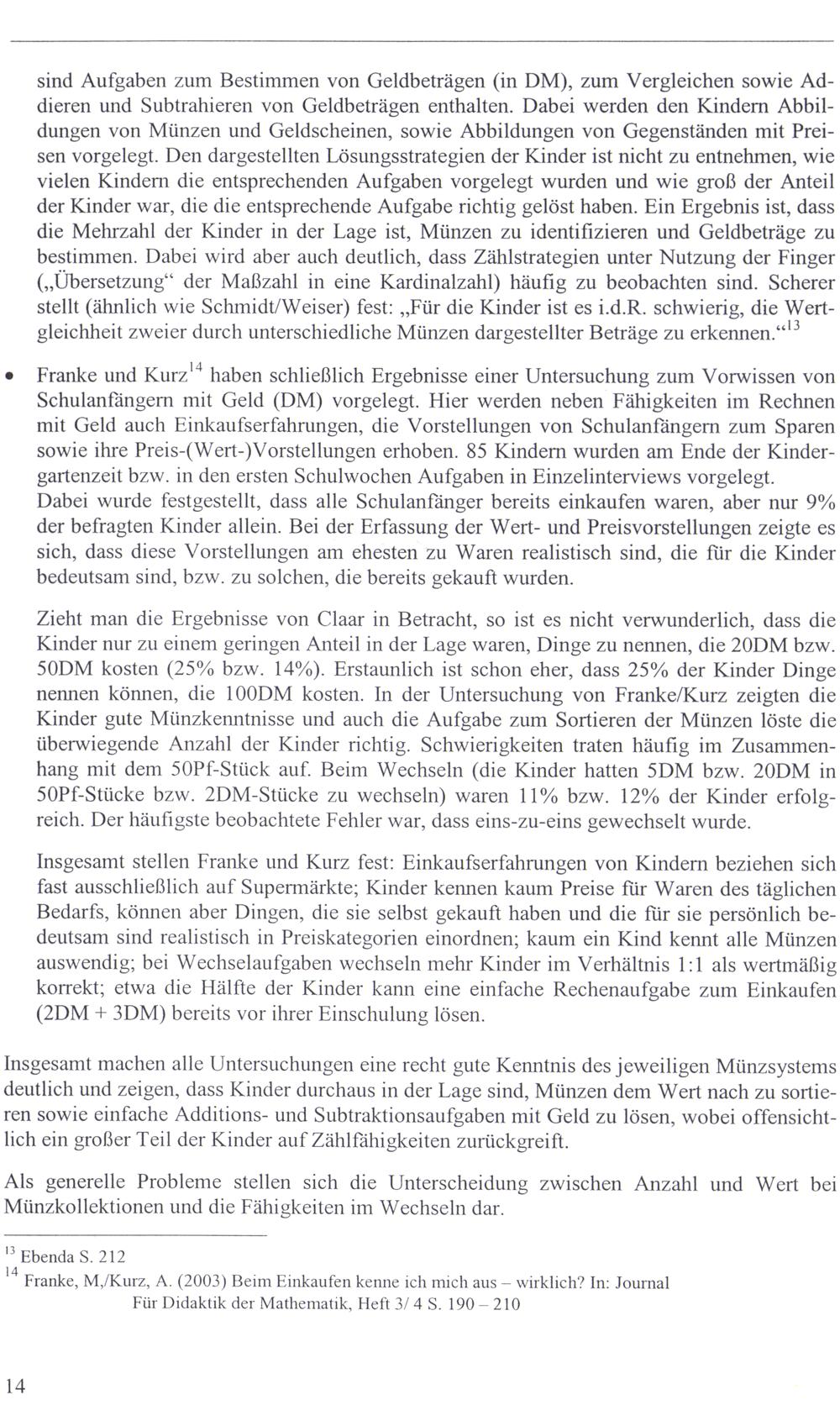 Zieht man die Ergebnisse von Claar in Betracht, so ist es nicht verwunderlich, dass die Kinder nur zu einem geringen Anteil in der Lage waren, Dinge zu nennen, die 20DM bzw. 50DM kosten(25% bzw. 14%). Erstaunlich ist schon eher, dass 25% der Kinder Dinge nennen können, die 100DM kosten. In der Untersuchung von Franke/Kurz zeigten die Kinder gute Münzkenntnisse und auch die Aufgabe zum Sortieren der Münzen löste die überwiegende Anzahl der Kinder richtig. Schwierigkeiten traten häufig im Zusammenhang mıt dem 50Pf-Stück auf. Beim Wechseln(die Kinder hatten 5DM bzw. 20DM in 50Pf-Stücke bzw. 2DM-Stücke zu wechseln) waren 11% bzw. 12% der Kinder erfolgreich. Der häufigste beobachtete Fehler war, dass eins-zu-eins gewechselt wurde.