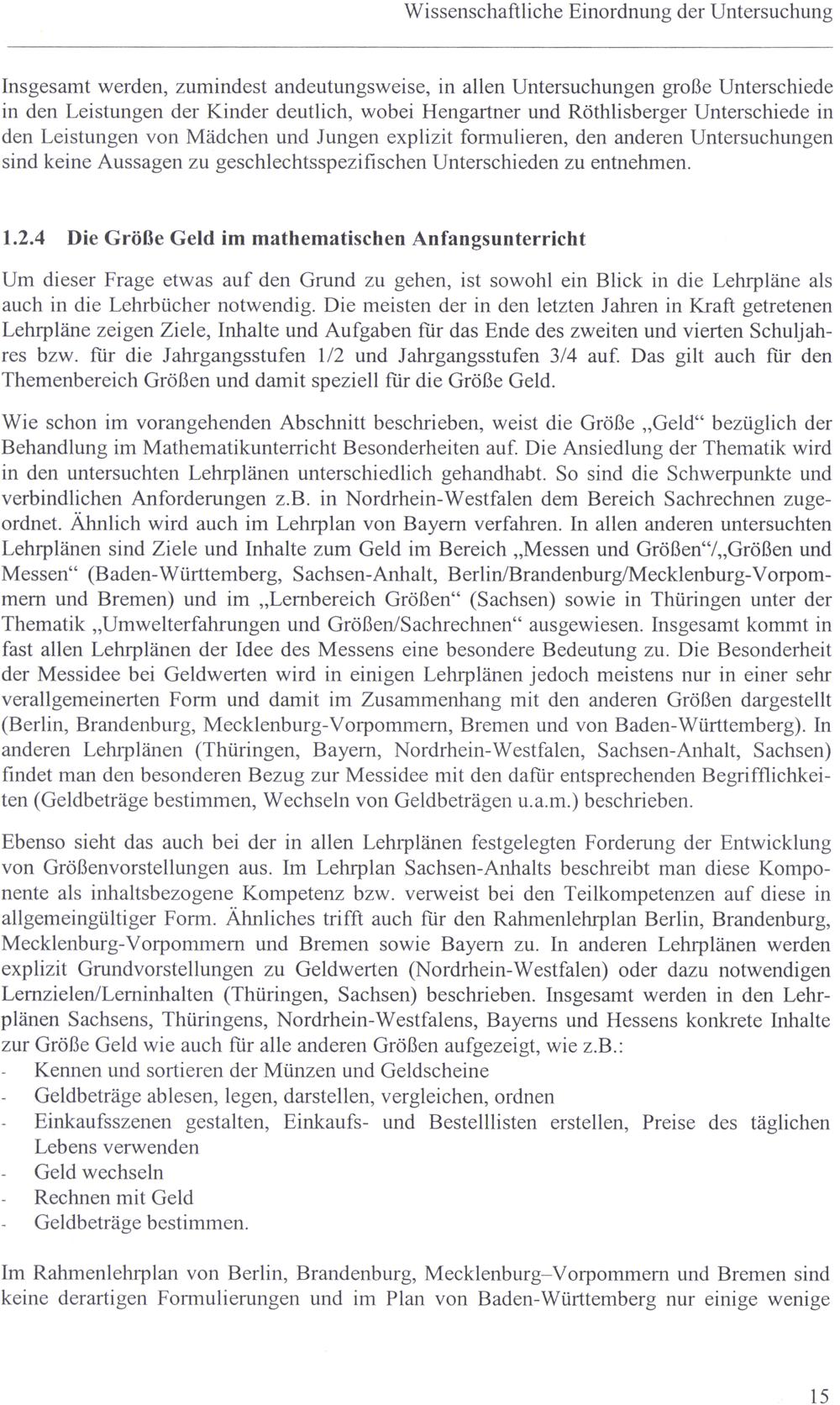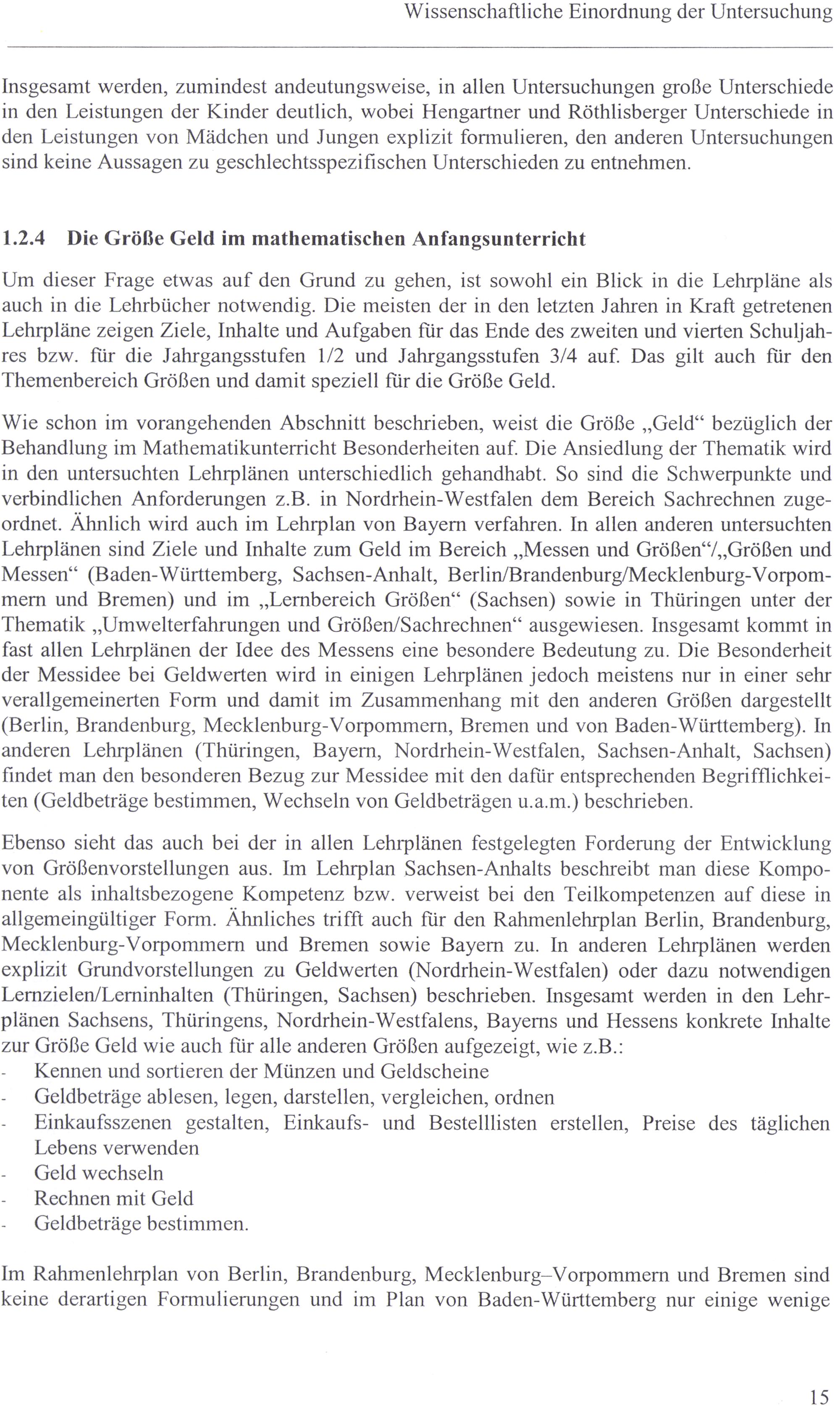 Wie schon im vorangehenden Abschnitt beschrieben, weist die Größe„Geld“ bezüglich der Behandlung im Mathematikunterricht Besonderheiten auf. Die Ansiedlung der Thematik wird ın den untersuchten Lehrplänen unterschiedlich gehandhabt. So sind die Schwerpunkte und verbindlichen Anforderungen z.B. ın Nordrhein- Westfalen dem Bereich Sachrechnen zugeordnet. Ähnlich wird auch im Lehrplan von Bayern verfahren. In allen anderen untersuchten Lehrplänen sind Ziele und Inhalte zum Geld im Bereich„Messen und Größen‘/,,Größen und Messen“(Baden-Württemberg, Sachsen-Anhalt, Berlin/Brandenburg/Mecklenburg-Vorpommern und Bremen) und ım„Lernbereich Größen‘(Sachsen) sowie ın Thüringen unter der Thematik„Umwelterfahrungen und Größen/Sachrechnen“‘ ausgewiesen. Insgesamt kommt in fast allen Lehrplänen der Idee des Messens eine besondere Bedeutung zu. Die Besonderheit der Messidee bei Geldwerten wird in einigen Lehrplänen jedoch meistens nur in einer sehr verallgemeinerten Form und damit im Zusammenhang mit den anderen Größen dargestellt (Berlin, Brandenburg, Mecklenburg-Vorpommern, Bremen und von Baden-Württemberg). In anderen Lehrplänen(Thüringen, Bayern, Nordrhein-Westfalen, Sachsen-Anhalt, Sachsen) findet man den besonderen Bezug zur Messidee mit den dafür entsprechenden Begrifflichkeiten(Geldbeträge bestimmen, Wechseln von Geldbeträgen u.a.m.) beschrieben.