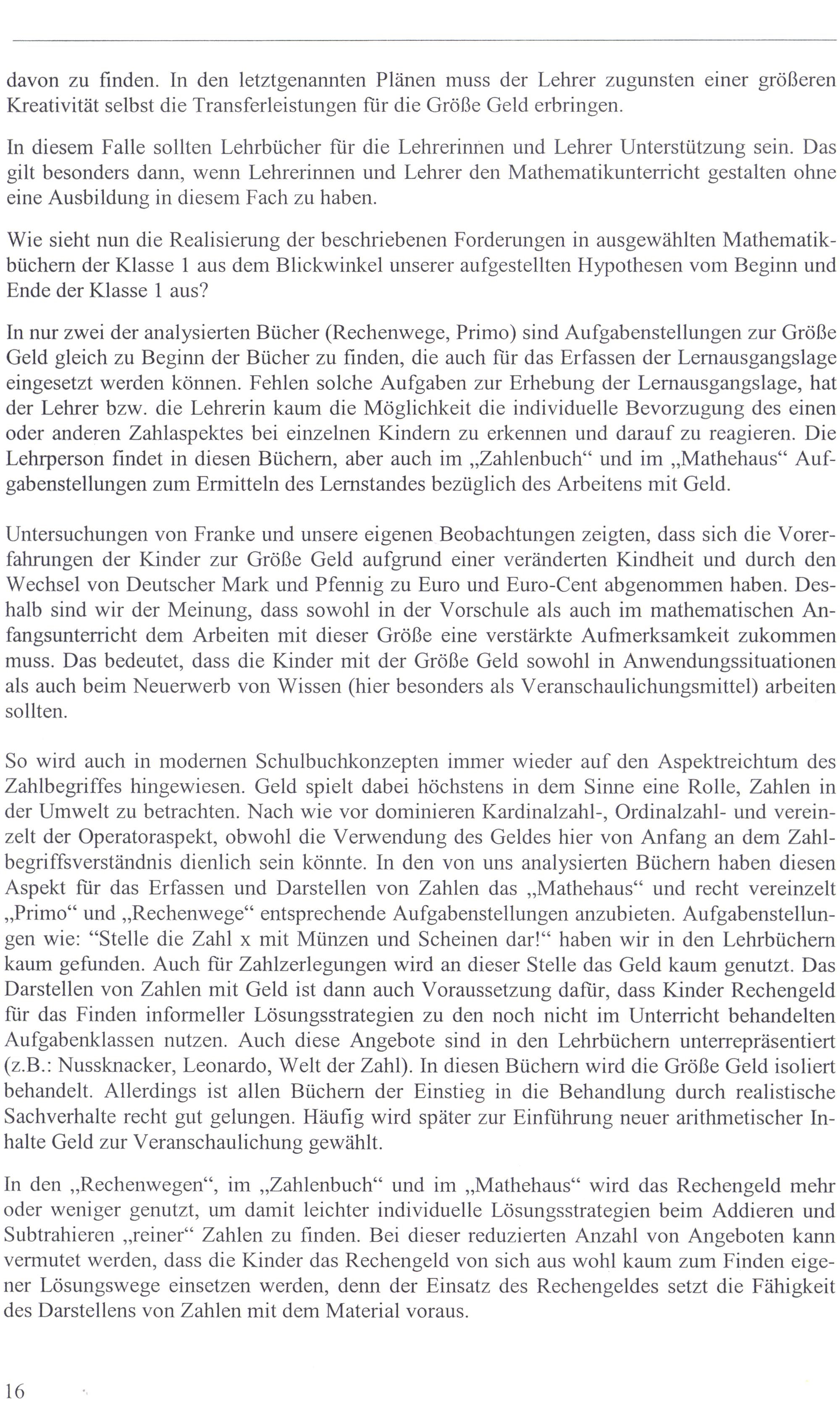 In nur zweı der analysierten Bücher(Rechenwege, Primo) sind Aufgabenstellungen zur Größe Geld gleich zu Beginn der Bücher zu finden, die auch für das Erfassen der Lernausgangslage eingesetzt werden können. Fehlen solche Aufgaben zur Erhebung der Lernausgangslage, hat der Lehrer bzw. die Lehrerin kaum die Möglichkeit die individuelle Bevorzugung des einen oder anderen Zahlaspektes bei einzelnen Kindern zu erkennen und darauf zu reagieren. Die Lehrperson findet ın diesen Büchern, aber auch ım„Zahlenbuch““ und ım„Mathehaus“ Aufgabenstellungen zum Ermitteln des Lernstandes bezüglich des Arbeitens mit Geld.