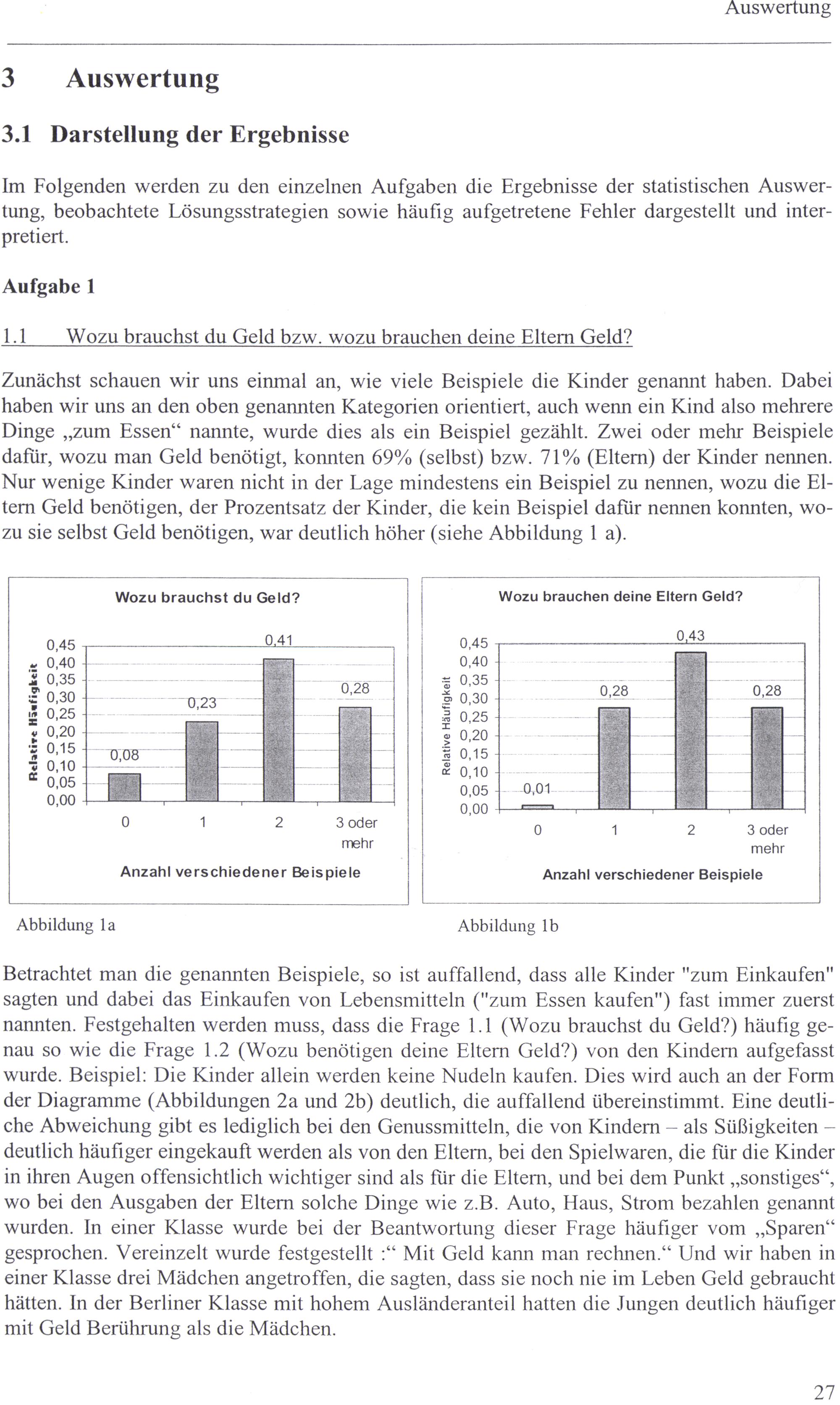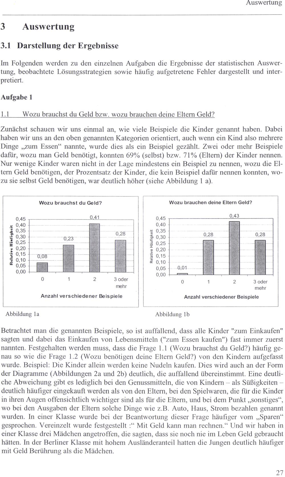 Betrachtet man die genannten Beispiele, so ist auffallend, dass alle Kinder"zum Einkaufen" sagten und dabei das Einkaufen von Lebensmitteln("zum Essen kaufen") fast immer zuerst nannten. Festgehalten werden muss, dass die Frage 1.1(Wozu brauchst du Geld?) häufig genau so wıe die Frage 1.2(Wozu benötigen deine Eltern Geld?) von den Kindern aufgefasst wurde. Beispiel: Die Kinder allein werden keine Nudeln kaufen. Dies wird auch an der Form der Diagramme(Abbildungen 2a und 2b) deutlich, die auffallend übereinstimmt. Eine deutliche Abweichung gibt es lediglich bei den Genussmitteln, die von Kindern— als Süßigkeiten— deutlich häufiger eingekauft werden als von den Eltern, bei den Spielwaren, die für die Kinder in ihren Augen offensichtlich wichtiger sind als für die Eltern, und bei dem Punkt„sonstiges“, wo bei den Ausgaben der Eltern solche Dinge wie z.B. Auto, Haus, Strom bezahlen genannt wurden. In einer Klasse wurde bei der Beantwortung dieser Frage häufiger vom„Sparen“ gesprochen. Vereinzelt wurde festgestellt:‘“ Mit Geld kann man rechnen.“ Und wir haben in einer Klasse drei Mädchen angetroffen, die sagten, dass sie noch nie im Leben Geld gebraucht hätten. In der Berliner Klasse mit hohem Ausländeranteil hatten die Jungen deutlich häufiger mit Geld Berührung als die Mädchen.