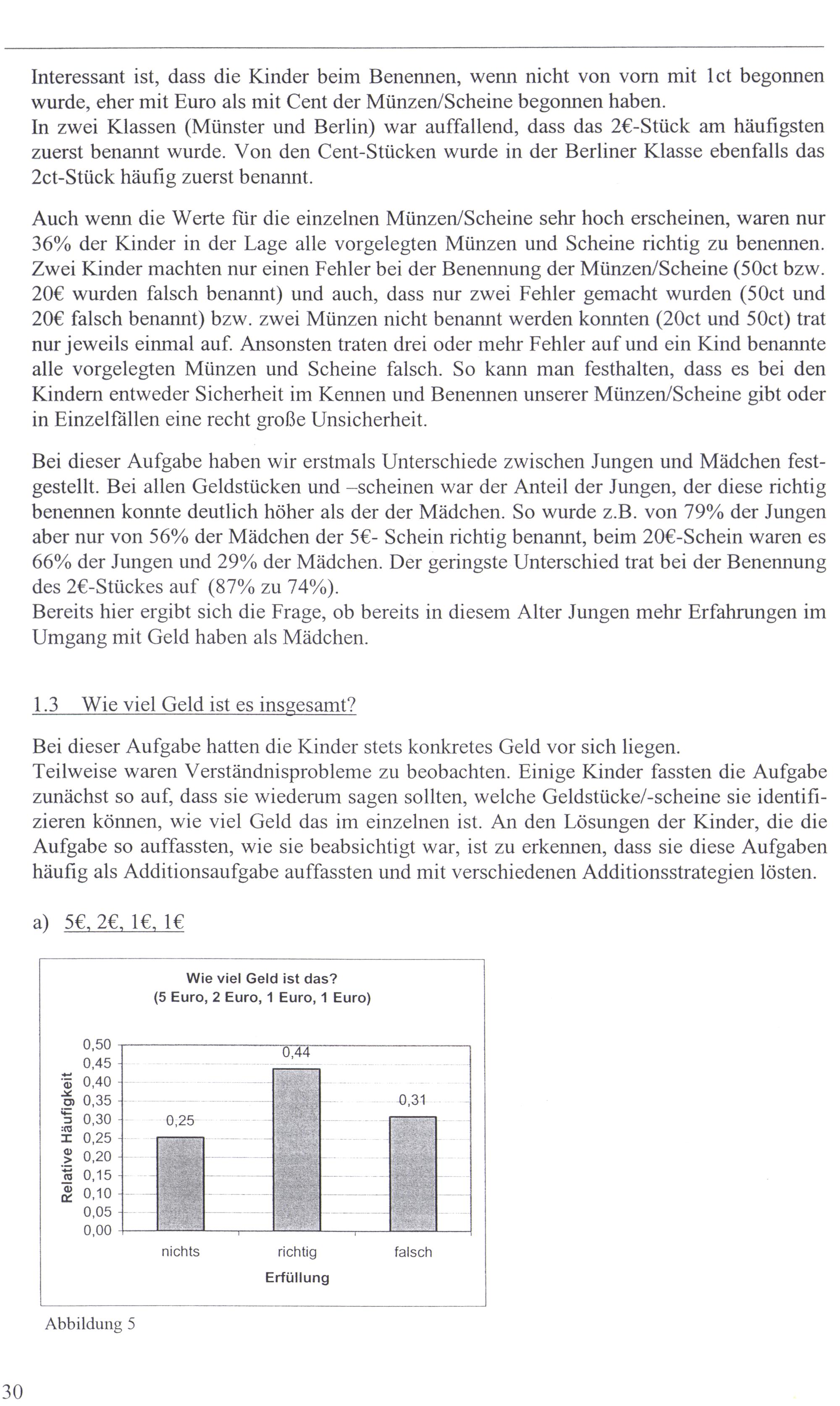 Teilweise waren Verständnisprobleme zu beobachten. Einige Kinder fassten die Aufgabe zunächst so auf, dass sıe wiederum sagen sollten, welche Geldstücke/-scheine sie identifizieren können, wie viel Geld das im einzelnen ist. An den Lösungen der Kinder, die die Aufgabe so auffassten, wie sie beabsichtigt war, ist zu erkennen, dass sie diese Aufgaben häufig als Addıtionsaufgabe auffassten und mit verschiedenen Additionsstrategien lösten.
