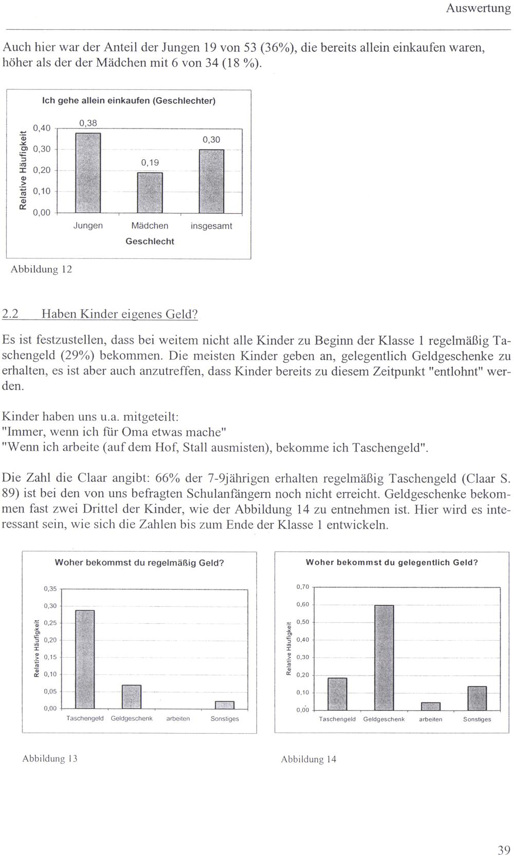 Die Zahl die Claar angibt: 66% der 7-9jährigen erhalten regelmäßig Taschengeld(Claar S. 89) ist beı den von uns befragten Schulanfängern noch nicht erreicht. Geldgeschenke bekommen fast zweı Drittel der Kinder, wie der Abbildung 14 zu entnehmen ist. Hier wird es interessant seın, wie sıch die Zahlen bis zum Ende der Klasse 1 entwickeln.