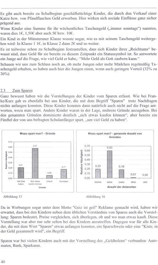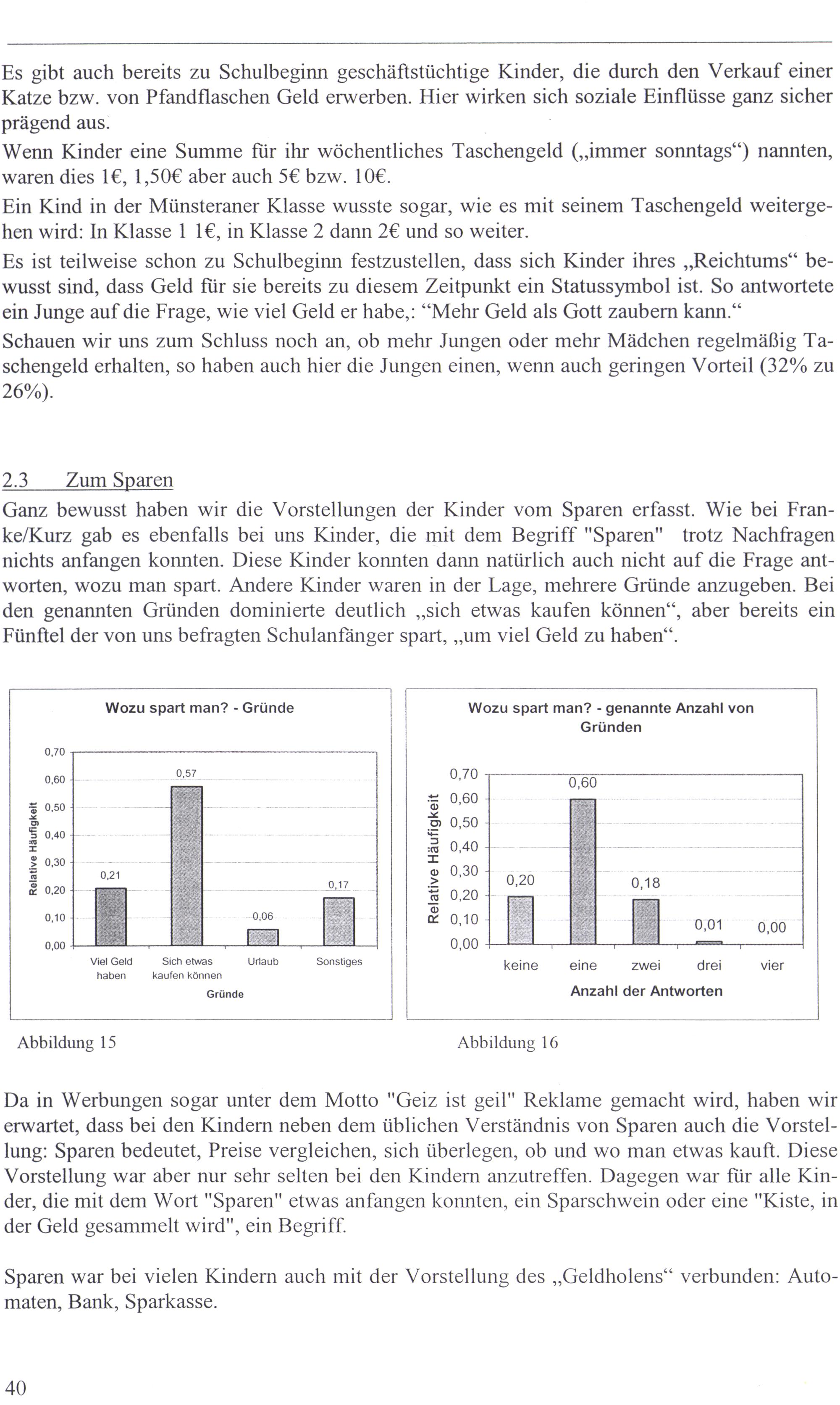 Ganz bewusst haben wir die Vorstellungen der Kinder vom Sparen erfasst. Wie bei Franke/Kurz gab es ebenfalls bei uns Kinder, die mit dem Begriff"Sparen" trotz Nachfragen nichts anfangen konnten. Diese Kinder konnten dann natürlich auch nicht auf die Frage antworten, wozu man spart. Andere Kinder waren in der Lage, mehrere Gründe anzugeben. Bei den genannten Gründen dominierte deutlich„sich etwas kaufen können“, aber bereits eın Fünftel der von uns befragten Schulanfänger spart,„um viel Geld zu haben“.