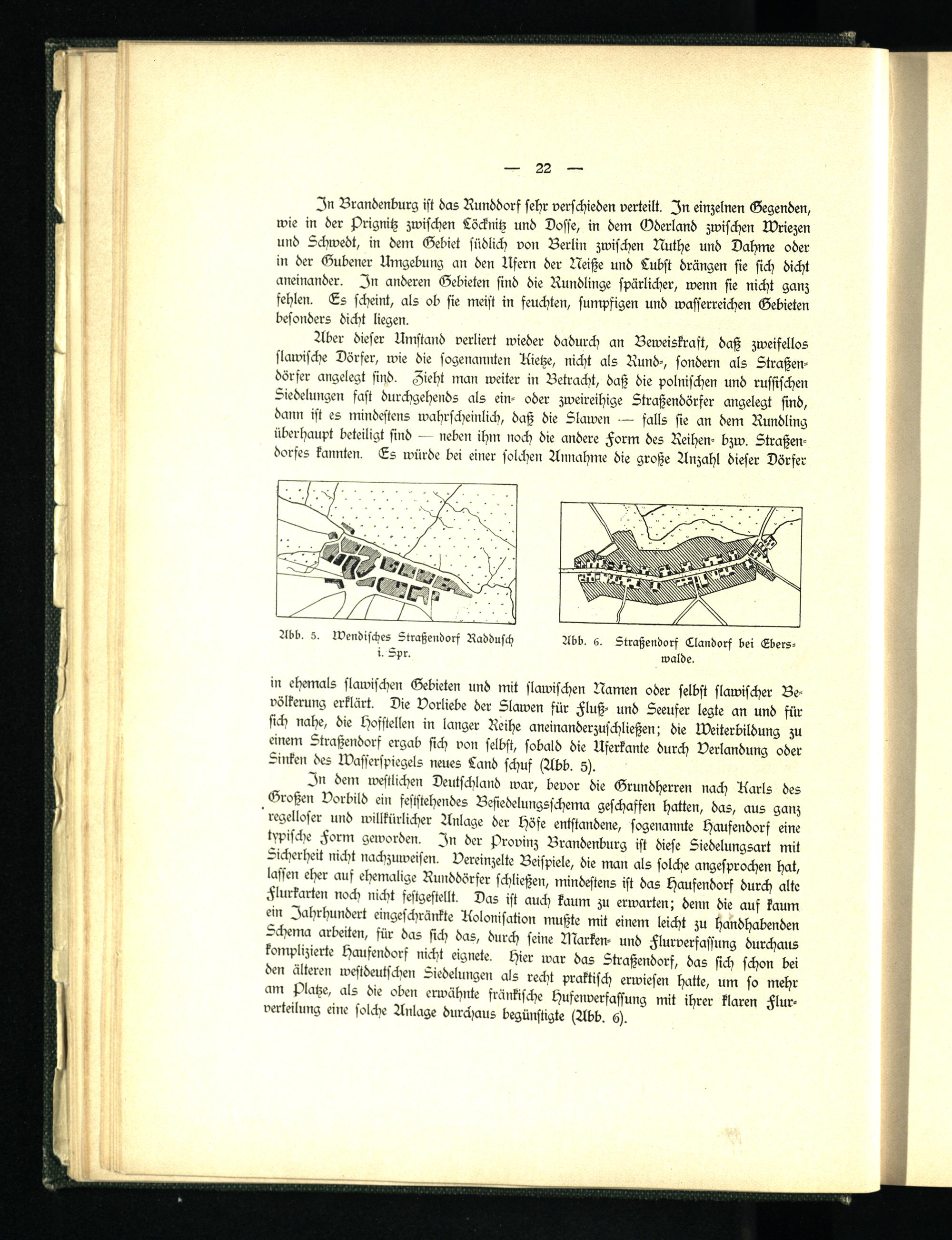 in ehemals slawischen Gebieten und mit slawischen Namen oder selbst slawischer Bevölkerung erklärt. Die Vorliebe der Slawen für Fluß- und Seeufer legte an und für sich nahe, die Hofstellen in langer Reihe aneinanderzuschließen; die Weiterbildung zu einem Straßendorf ergab sich von selbst, sobald die Uferkante durch Verlandung oder Sinken des Wasserspiegels neues Land schuf (Abb. 5).