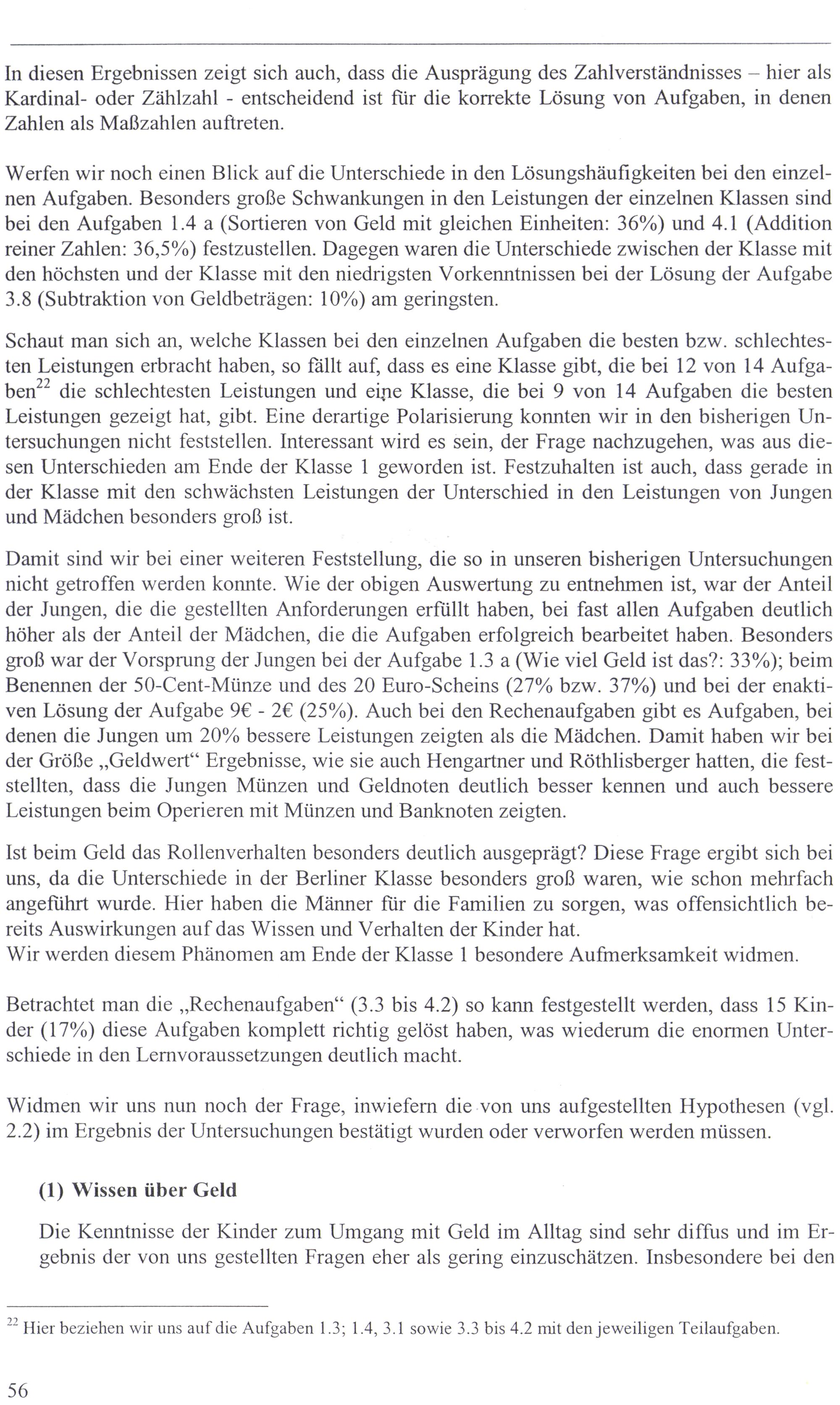Damit sind wir beı einer weiteren Feststellung, die so in unseren bisherigen Untersuchungen nicht getroffen werden konnte. Wie der obigen Auswertung zu entnehmen ist, war der Anteil der Jungen, die die gestellten Anforderungen erfüllt haben, bei fast allen Aufgaben deutlich höher als der Anteil der Mädchen, die die Aufgaben erfolgreich bearbeitet haben. Besonders groß war der Vorsprung der Jungen bei der Aufgabe 1.3 a(Wie viel Geld ist das?: 33%); beim Benennen der 50-Cent-Münze und des 20 Euro-Scheins(27% bzw. 37%) und bei der enaktıven Lösung der Aufgabe 9€- 2€(25%). Auch bei den Rechenaufgaben gibt es Aufgaben, bei denen die Jungen um 20% bessere Leistungen zeigten als die Mädchen. Damit haben wir bei der Größe„Geldwert‘ Ergebnisse, wie sie auch Hengartner und Röthlisberger hatten, die feststellten, dass die Jungen Münzen und Geldnoten deutlich besser kennen und auch bessere Leistungen beim Operieren mıt Münzen und Banknoten zeigten.
