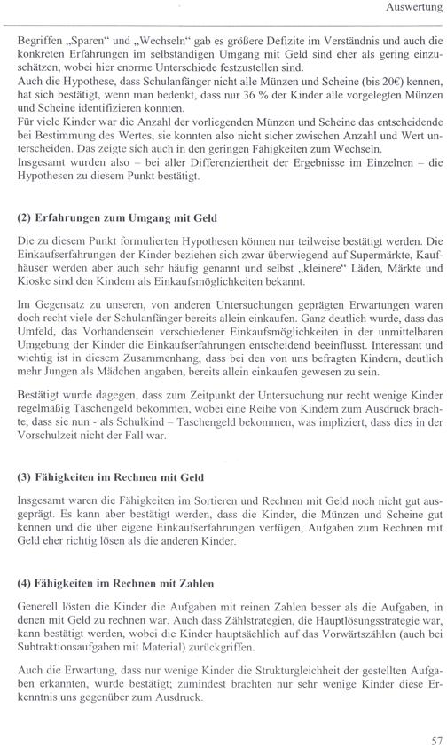 Begriffen„Sparen“ und„Wechseln“ gab es größere Defizite im Verständnis und auch die konkreten Erfahrungen im selbständigen Umgang mit Geld sind eher als gering einzuschätzen, wobeı hıer enorme Unterschiede festzustellen sind.
