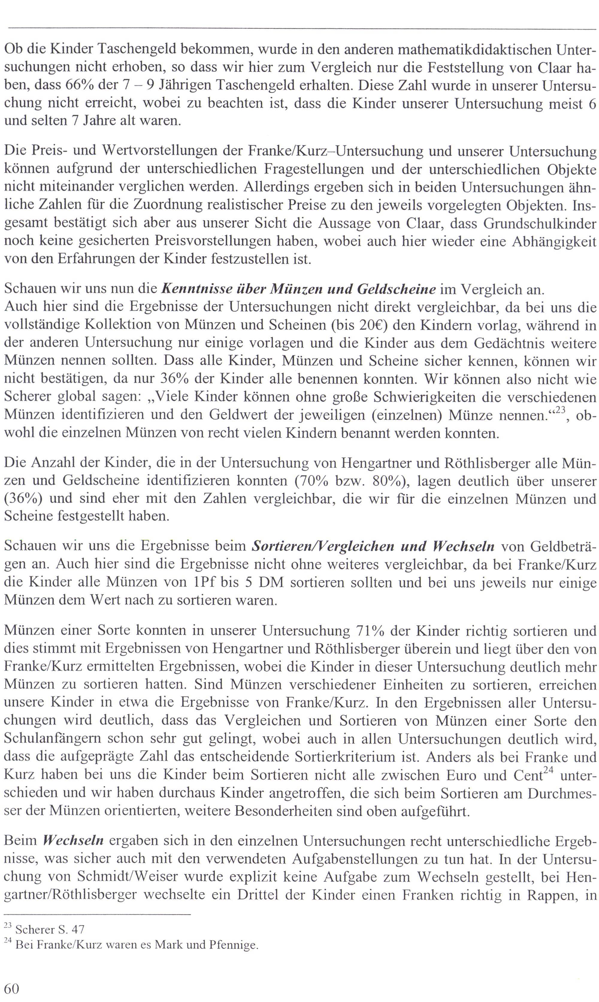 Auch hier sınd die Ergebnisse der Untersuchungen nicht direkt vergleichbar, da bei uns die vollständige Kollektion von Münzen und Scheinen(bis 20€) den Kindern vorlag, während in der anderen Untersuchung nur einige vorlagen und die Kinder aus dem Gedächtnis weitere Münzen nennen sollten. Dass alle Kinder, Münzen und Scheine sicher kennen, können wir nicht bestätigen, da nur 36% der Kinder alle benennen konnten. Wir können also nicht wie Scherer global sagen:„Viele Kinder können ohne große Schwierigkeiten die verschiedenen Münzen identifizieren und den Geldwert der jeweiligen(einzelnen) Münze nennen.‘““, obwohl die einzelnen Münzen von recht vielen Kindern benannt werden konnten.