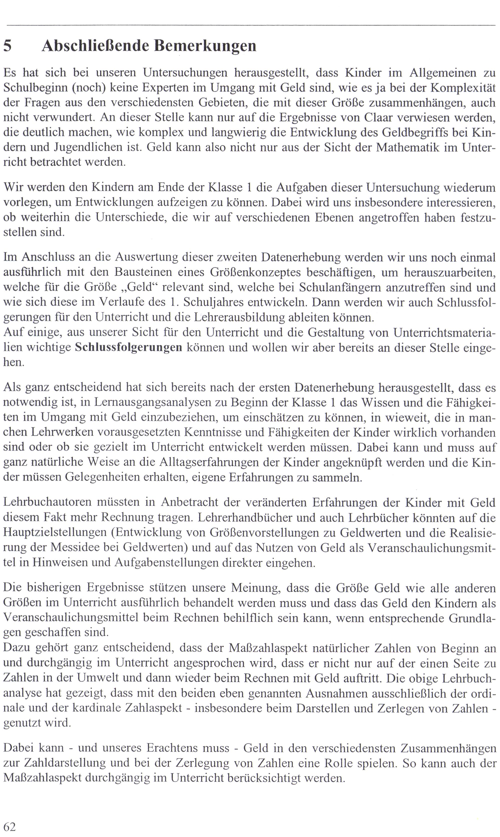 Die bisherigen Ergebnisse stützen unsere Meinung, dass die Größe Geld wie alle anderen Größen ım Unterricht ausführlich behandelt werden muss und dass das Geld den Kindern als Veranschaulichungsmittel beim Rechnen behilflich sein kann, wenn entsprechende Grundlagen geschaffen sind.