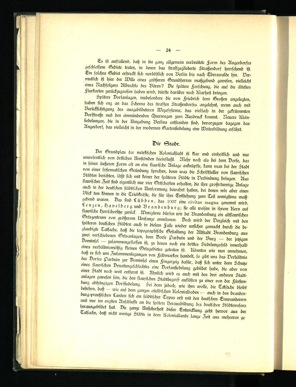Spätere Dorfanlagen, insbesondere die von Friedrich dem Großen angelegten, baden sich eng an das Schema des straffen Straßendorfes angelehnt, wenn auch mit Berücksichtigung des ausgebildeteren Wegesystems, das vielfach in der gekrümmten Dorfstraße nud den einmündenden (Iuerwegen zürn Ausdruck kommt. Neuere Kleinsiedelungen, die in der Umgebung Berlins entstanden sind, bevorzugen dagegen das Angerdorf, das vielleicht in der modernen Gartensiedelung eine Weiterbildung erfährt.