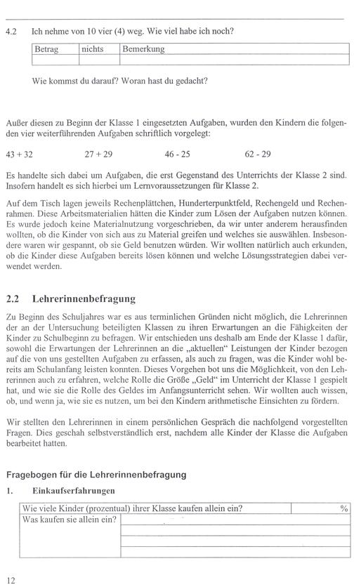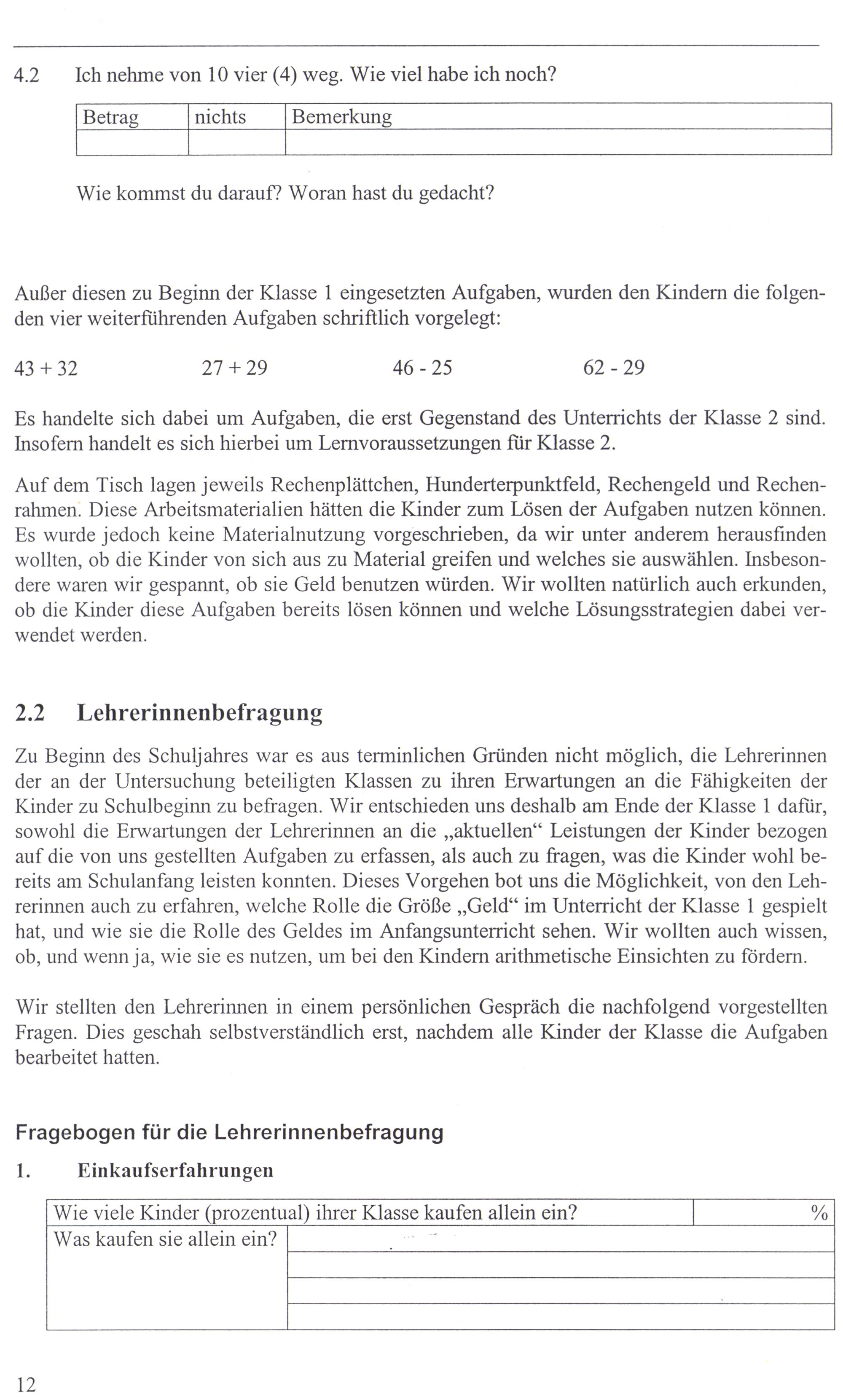 Zu Beginn des Schuljahres war es aus terminlichen Gründen nicht möglich, die Lehrerinnen der an der Untersuchung beteiligten Klassen zu ihren Erwartungen an die Fähigkeiten der Kinder zu Schulbeginn zu befragen. Wir entschieden uns deshalb am Ende der Klasse 1 dafür, sowohl die Erwartungen der Lehrerinnen an die„aktuellen“ Leistungen der Kinder bezogen auf die von uns gestellten Aufgaben zu erfassen, als auch zu fragen, was die Kinder wohl bereits am Schulanfang leisten konnten. Dieses Vorgehen bot uns die Möglichkeit, von den Lehrerinnen auch zu erfahren, welche Rolle die Größe„Geld“ im Unterricht der Klasse 1 gespielt hat, und wie sie die Rolle des Geldes im Anfangsunterricht sehen. Wir wollten auch wissen, ob, und wenn Ja, wıe sie es nutzen, um bei den Kindern arıthmetische Einsichten zu fördern.
