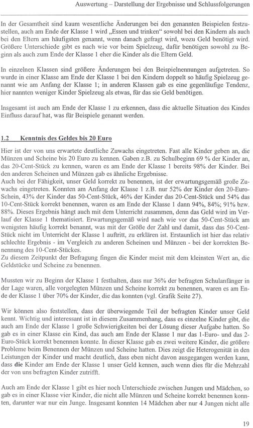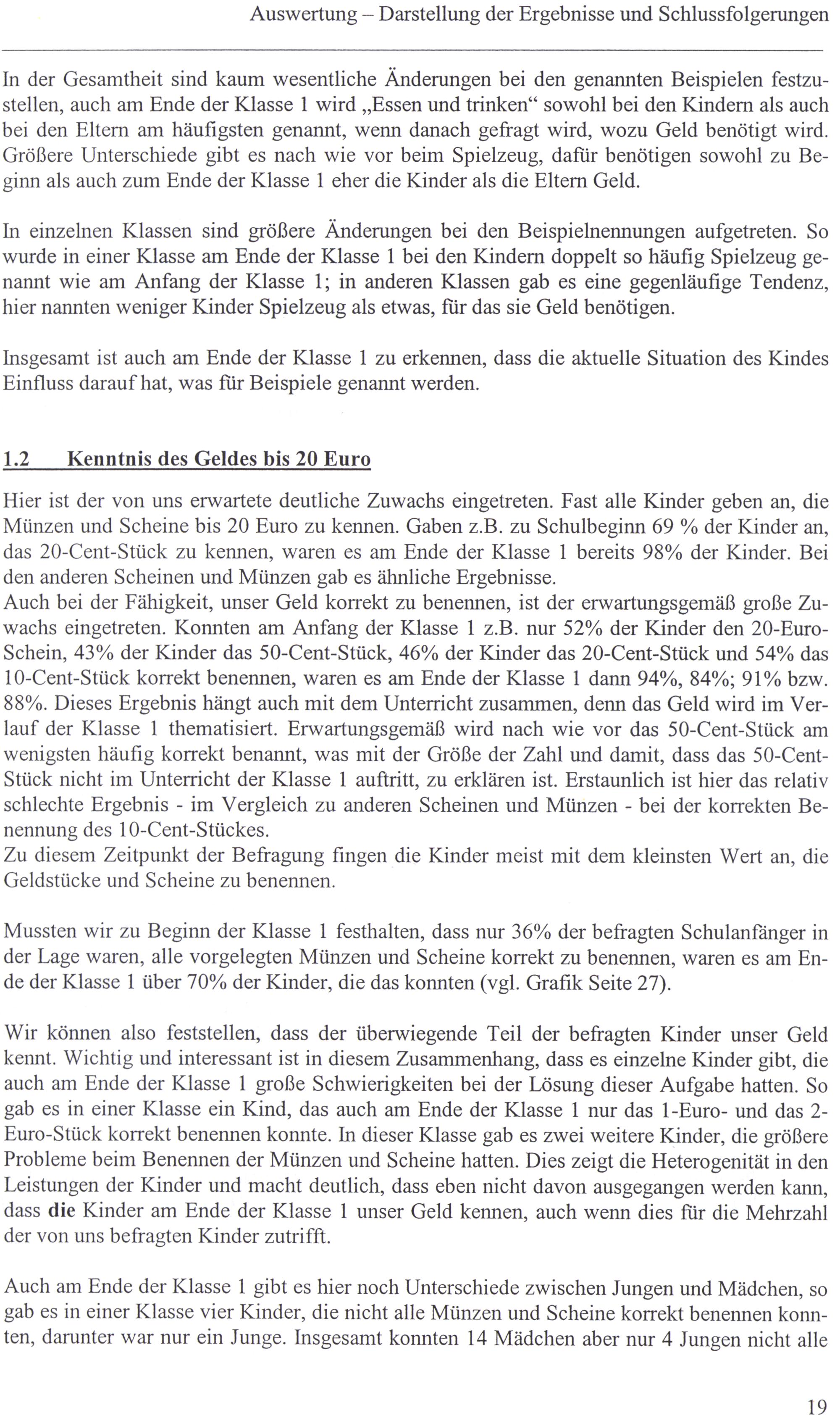 In einzelnen Klassen sind größere Änderungen bei den Beispielnennungen aufgetreten. So wurde in einer Klasse am Ende der Klasse 1 bei den Kindern doppelt so häufig Spielzeug genannt wie am Anfang der Klasse 1; in anderen Klassen gab es eine gegenläufige Tendenz, hier nannten weniger Kinder Spielzeug als etwas, für das sie Geld benötigen.