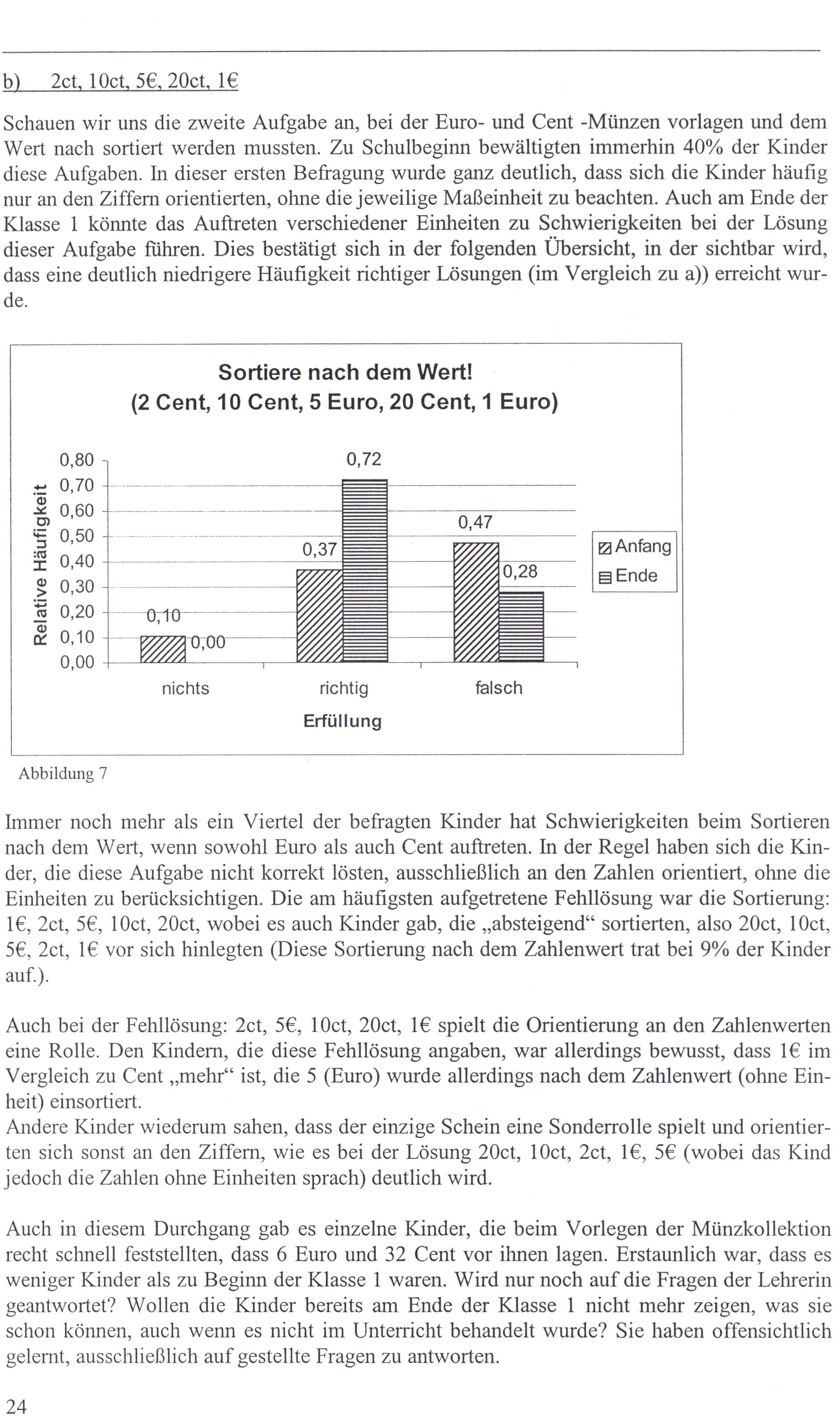Immer noch mehr als ein Viertel der befragten Kinder hat Schwierigkeiten beim Sortieren nach dem Wert, wenn sowohl Euro als auch Cent auftreten. In der Regel haben sich die Kinder, die diese Aufgabe nicht korrekt lösten, ausschließlich an den Zahlen orientiert, ohne die Einheiten zu berücksichtigen. Die am häufigsten aufgetretene Fehllösung war die Sortierung: l€, 2ct, 5€, 10ct, 20et, wobei es auch Kinder gab, die„absteigend““ sortierten, also 20ct, 10ct, S5€, 2ct, 1€ vor sich hinlegten(Diese Sortierung nach dem Zahlenwert trat bei 9% der Kinder auf.).