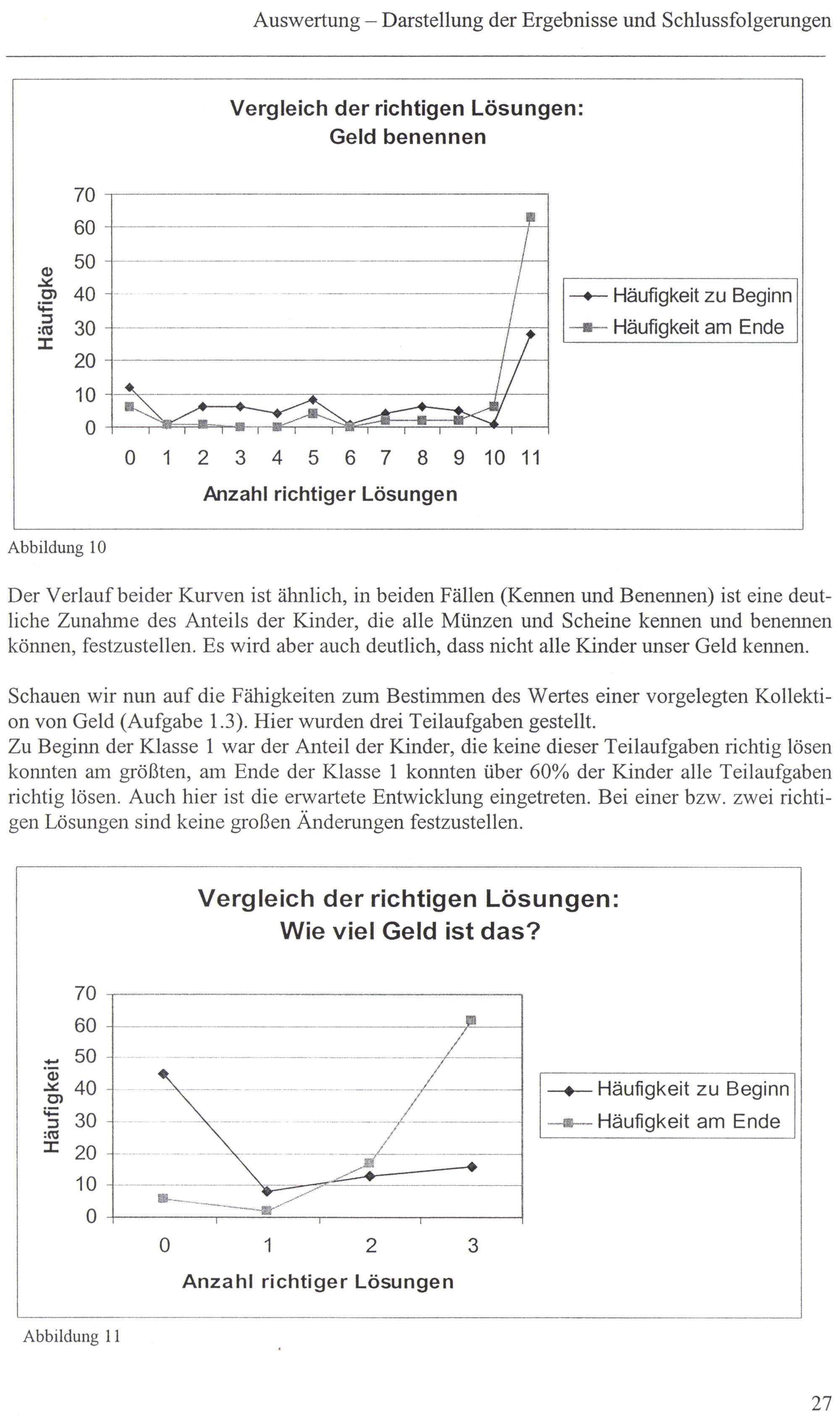 Der Verlauf beider Kurven ist ähnlich, in beiden Fällen(Kennen und Benennen) ist eine deutliche Zunahme des Anteils der Kinder, die alle Münzen und Scheine kennen und benennen können, festzustellen. Es wird aber auch deutlich, dass nicht alle Kinder unser Geld kennen.