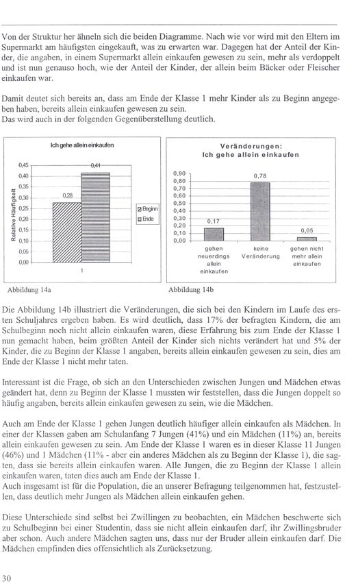 Auch am Ende der Klasse 1 gehen Jungen deutlich häufiger allein einkaufen als Mädchen. In einer der Klassen gaben am Schulanfang 7 Jungen(41%) und ein Mädchen(11%) an, bereits allein einkaufen gewesen zu sein. Am Ende der Klasse 1 waren es in dieser Klasse 11 Jungen (46%) und 1 Mädchen(11%- aber ein anderes Mädchen als zu Beginn der Klasse 1), die sagten, dass sie bereits allein einkaufen waren. Alle Jungen, die zu Beginn der Klasse 1 allein einkaufen waren, taten dies auch am Ende der Klasse 1.