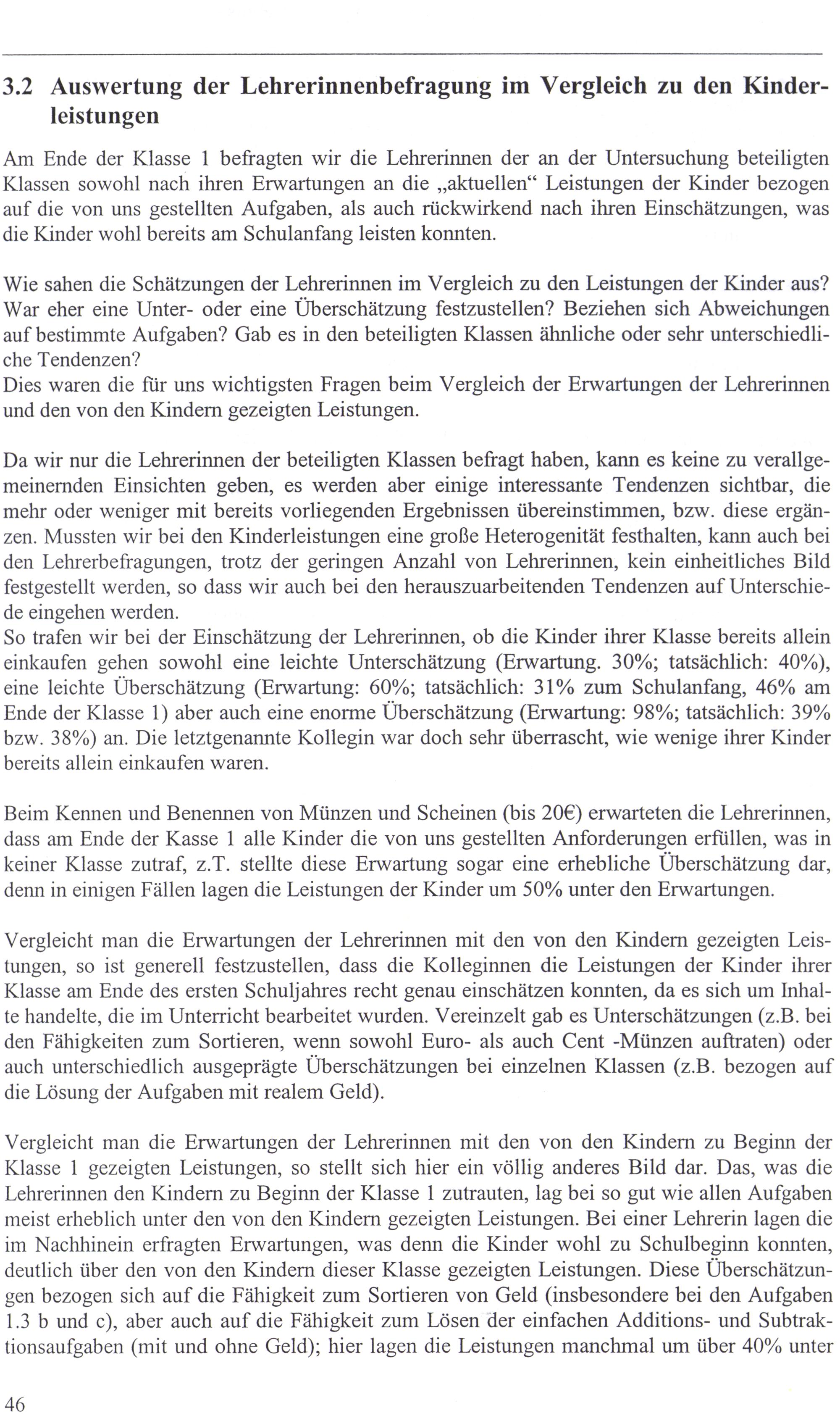 Vergleicht man die Erwartungen der Lehrerinnen mit den von den Kindern gezeigten Leistungen, so ist generell festzustellen, dass die Kolleginnen die Leistungen der Kinder ihrer Klasse am Ende des ersten Schuljahres recht genau einschätzen konnten, da es sich um Inhalte handelte, die im Unterricht bearbeitet wurden. Vereinzelt gab es Unterschätzungen(z.B. beı den Fähigkeiten zum Sortieren, wenn sowohl Euro- als auch Cent-Münzen auftraten) oder auch unterschiedlich ausgeprägte Überschätzungen bei einzelnen Klassen(z.B. bezogen auf die Lösung der Aufgaben mit realem Geld).