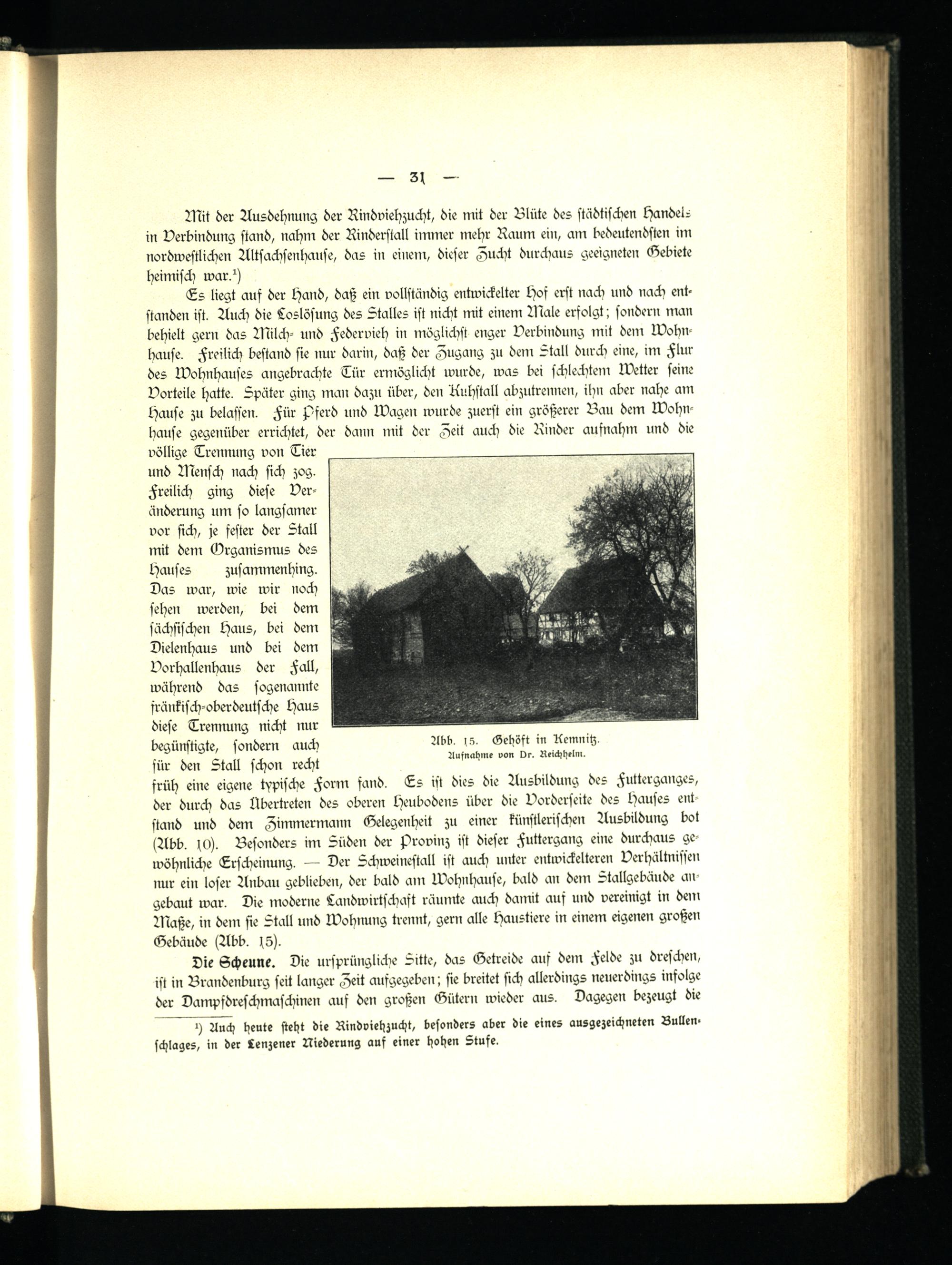 Ls liegt aus der Hand, daß ein vollständig entwickelter Hof erst nach und nach entstanden ist. Auch die Loslösung des Stalles ist nicht mit einem Riale erfolgt; sondern man behielt gern das Riilch- und Federvieh in möglichst enger Verbindung init dem Mohnbause. Freilich bestand sie nur darin, -aß der Zugang zu dem Stall durch eine, im Flur des Mohnhauses angebrachte Tür ermöglicht wurde, was bei schlechtem Metter seine Vorteile hatte. Später ging man dazu über, den Auhstall abzutrennen, ihn aber nahe am Hause zu belassen. Für Pferd und Magen wurde zuerst ein größerer Vau dem Mohnbause gegenüber errichtet, der dann mit der Zeit auch die Rinder ausnahm und die völlige Trennung von Tier und Riensch nach sich zog.