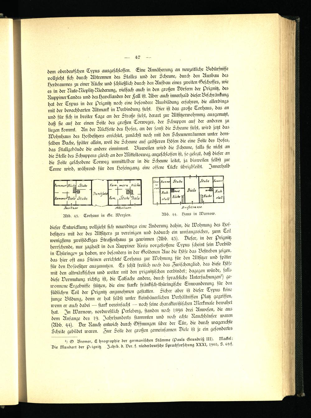 dieser Entwicklung vollzieht sich neuerdings eine Änderung dahin, die Wohnung des Hofbesitzers mit der des Altsitzers zu vereinigen und dadurch ein umfangreiches, zum Teil wenigstens zweistöckiges Straßenhaus zu gewinnen iAbb. 45). Dieser, in der j)rignitz herrschende, nur zaghaft in den Ruppiner Areis vorgestoßene Typus scheint sein Vorbild in Thüringen zu haben, wo besonders in der Goldenen Aue die Höfe das Bestreben zeigen, das hier oft aus Steinen errichtete Torhaus zur Wohnung für den Altsitzer und später für den Hofbesitzer auszunutzen. Es fehlt freilich noch das Zwischenglied, das diese Höfe mit den altmärkischen und weiter mit den prignitzischen verbindet; dagegen würde, falls diese Vermutung richtig ist, die Tatsache andere, durch sprachliche Untersuchungen^ gewonnene Ergebnisse stützen, die eine starke fränkisch-thüringische Einwanderung für den südlichen Teil der Prignitz anzunehmen gestatten. Sicher aber ist dieser Typus keine junge Bildung, denn er hat selbst unter kleinbäuerlichen Verhältnissen s)latz gegriffen, wenn er auch dabei — stark vereinfacht — noch seine charakteristischen Merkmale bewahrt hat. In Warnow, nordwestlich j?erleberg, standen noch !8Y8 drei Anwesen, die aus dem Anfänge des (y. Jahrhunderts stammten und noch echte Rauchhäuser waren (Abb. 44 ). Der Rauch entwich durch Öffnungen über der Tür, die durch wagerechte Scheite gebildet waren. Zur Seite der großen gemeinsamen Diele ist je ein gesondertes