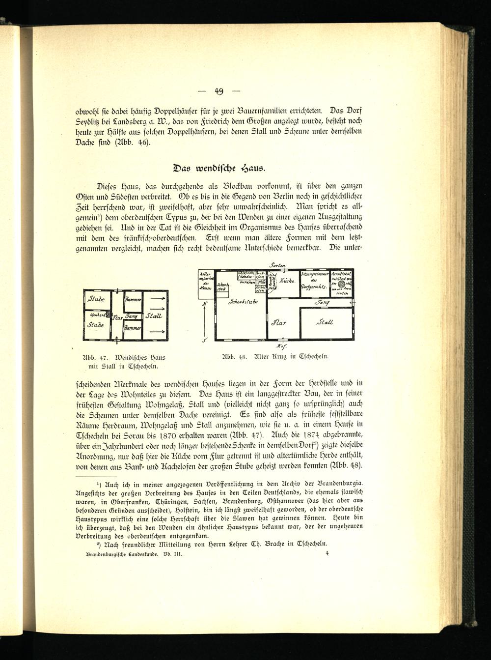 0 Auch ich in meiner angezogenen Veröffentlichung in dem Archiv der Braudenburgia. Angesichts der großen Verbreitung des Hauses in den Teilen Deutschlands, die ehemals slawisch waren, in Gberfranken, Thüringen, Sachsen, Brandenburg, Vsthannover (das hier aber aus besonderen Gründen ausscheidet), Holstein, bin ich längst zweifelhaft geworden, ob der oberdeutsche Haustypus wirklich eine solche Herrschaft über die Slawen hat gewinnen können. Heute bin ich überzeugt, daß bei den Menden ein ähnlicher Haustypus bekannt war, der der ungeheuren Verbreitung des oberdeutschen entgegenkam.