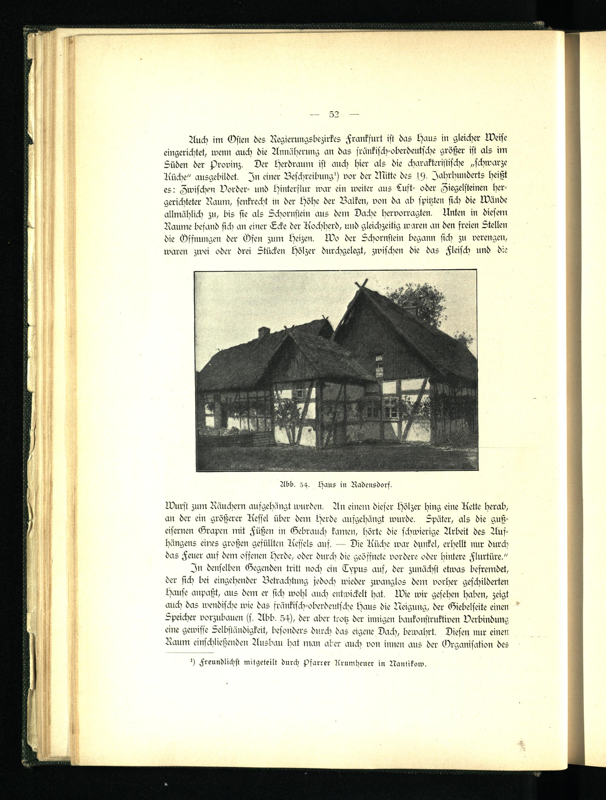 Auch im Osten des Regierungsbezirkes Frankfurt ist das Haus in gleicher weise eingerichtet, wenn auch die Annäherung an das fränkisch-oberdeutsche größer ist als im Süden der Provinz. Der Herdraum ist auch hier als die charakteristische „schwarze Kückie" ausgebildet. Rn einer Beschreibung^) vor der Witte des lch, Hahrhunderts heißt es: Zwischen Vorder- und Hinterflur war ein weiter aus Luft- oder Ziegelsteinen hergerichteter Nauru, senkrecht in der höhe der Balken, von da ab spitzten sich die wände allmählich zu, bis sie als Schornstein aus dein Dache hervorratzten. Unten in diesen! Raume befand sich an einer Lcke der Kochherd, und gleichzeitig waren an den freien Stellen die Öffnungen der Ofen zum Heizen, wo der Schornstein begann sich zu verengen, waren zwei oder drei Stücken Hölzer durchgelegt, zwischen die das Fleisch und die