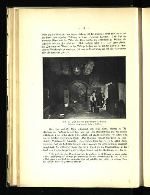 mehr zog sich dieser aus dem engen Verband mit der Stalldiele zurück und wurde mit der hinter ihm liegenden Wohnung zu einem besonderen wohnteil. Noch sehlt die trennende wand mit der Diele, aber schon werden die Seitenarme zu Gelassen abgesondert und das Flet selbst mit Möbeln versehen (Abb. "ich Den letzten Schritt, den Flet durch eine Mauer von der Diele zu sondern und sie mit den Stuben zu einem großen Wohnkomplex zu vereinigen, hat man in Brandenburg erst seit zwei Jahrzehnten und sehr schüchtern gemacht.