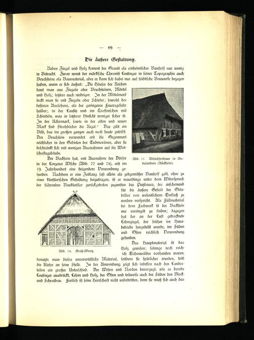 für die äußere Gestalt der Vrts- bilder von wesentlichem Einfluß zu werden verspricht. Als Füllmaterial bei dem Fachwerk ist der Backstein nur vereinzelt zu finden; dagegen hat der an der Luft getrocknete Lehmziegel, der früher im Hausbetriebe hergestellt wurde, im Süden und Osten reichlich Verwendung gefunden.