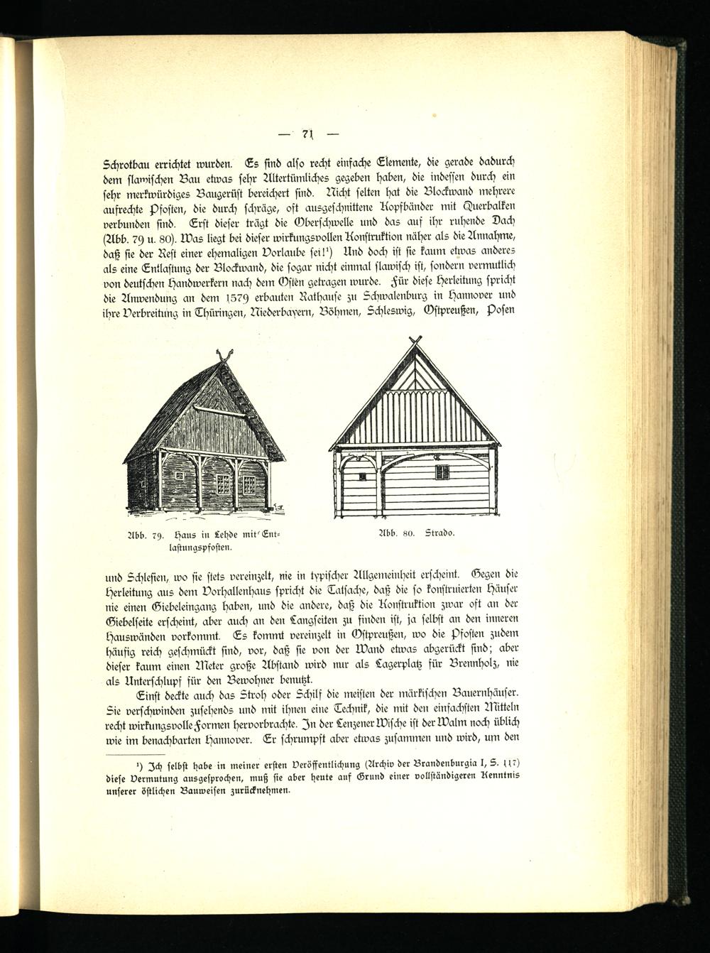 Schrotbau errichtet wurden. Es sind also recht einfache Elemente, die gerade dadurch dem slawischen Bau etwas sehr Altertümliches gegeben haben, die indessen durch ein sehr merkwürdiges Baugerüst bereichert sind. Nicht selten hat die Blockwand mehrere aufrechte Pfosten, die durch schräge, oft ausgeschnittene Kopfbänder mit Querbalken verbunden sind. Erst dieser trägt die Oberschwelle und das aus ihr ruhende Dach (Abb. u. 80). Was liegt bei dieser wirkungsvollen Konstruktion näher als die Annahme, daß sie der Rest einer ehemaligen Vorlaube seilst Und doch ist sie kaum etwas anderes als eine Entlastung der Blockwand, die sogar nicht einmal slawisch ist, sondern vermutlich von deutschen Handwerkern nach dem Osten getragen wurde. Für diese Herleitung spricht die Anwendung an dem (579 erbauten Rathause zu Schwalenburg in Hannover und ihre Verbreitung in Thüringen, Niederbayern, Böhmen, Schleswig, Ostpreußen, Posen
