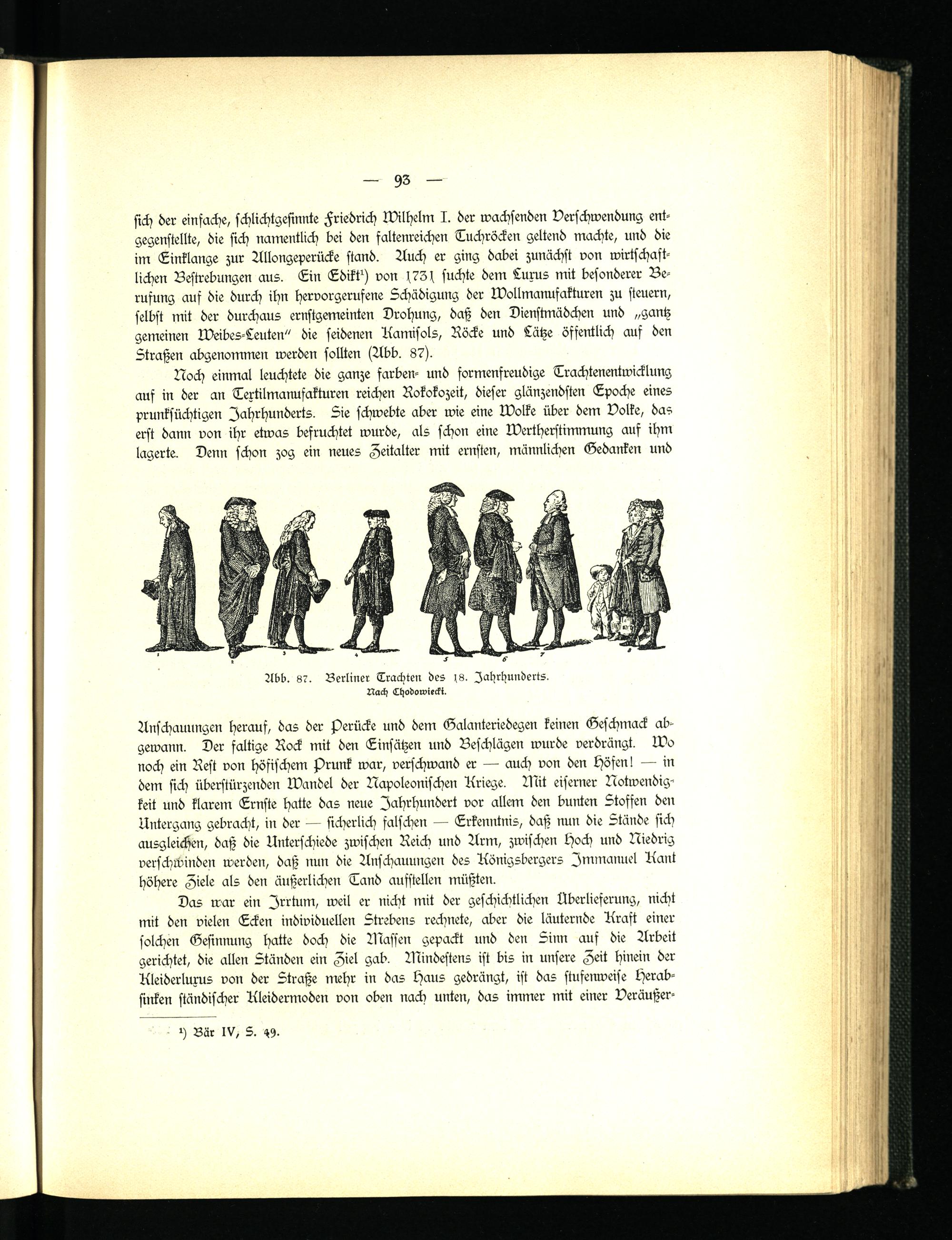 sich -er einfache, schlichtgesinnte Friedrich Wilhelm I. -er wachsenden Verschwendung entgegenstellte, die sich namentlich bei den faltenreichen Tuchröcken geltend machte, und die im Linklange zur Allongeperücke stand. Auch er ging dabei zunächst von wirtschaftlichen Bestrebungen aus. Lin Ldikll) von 1 72 s suchte dem Luxus mit besonderer Berufung auf die durch ihn hervorgerufene Schädigung der Wollmanufakturen zu steuern, selbst mit der durchaus ernstgemeinten Drohung, daß den Dienstmädchen und „gantz gemeinen Weibes-Leuten" die seidenen Kamisols, Röcke und Lätze öffentlich auf den Straßen abgenommen werden sollten (Abb. 87 ).