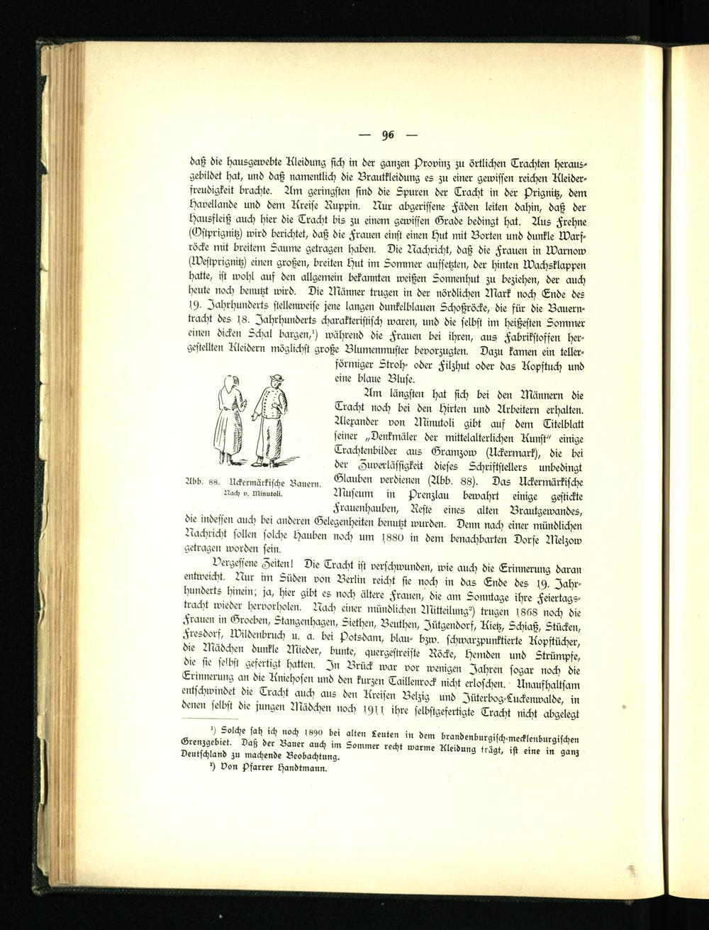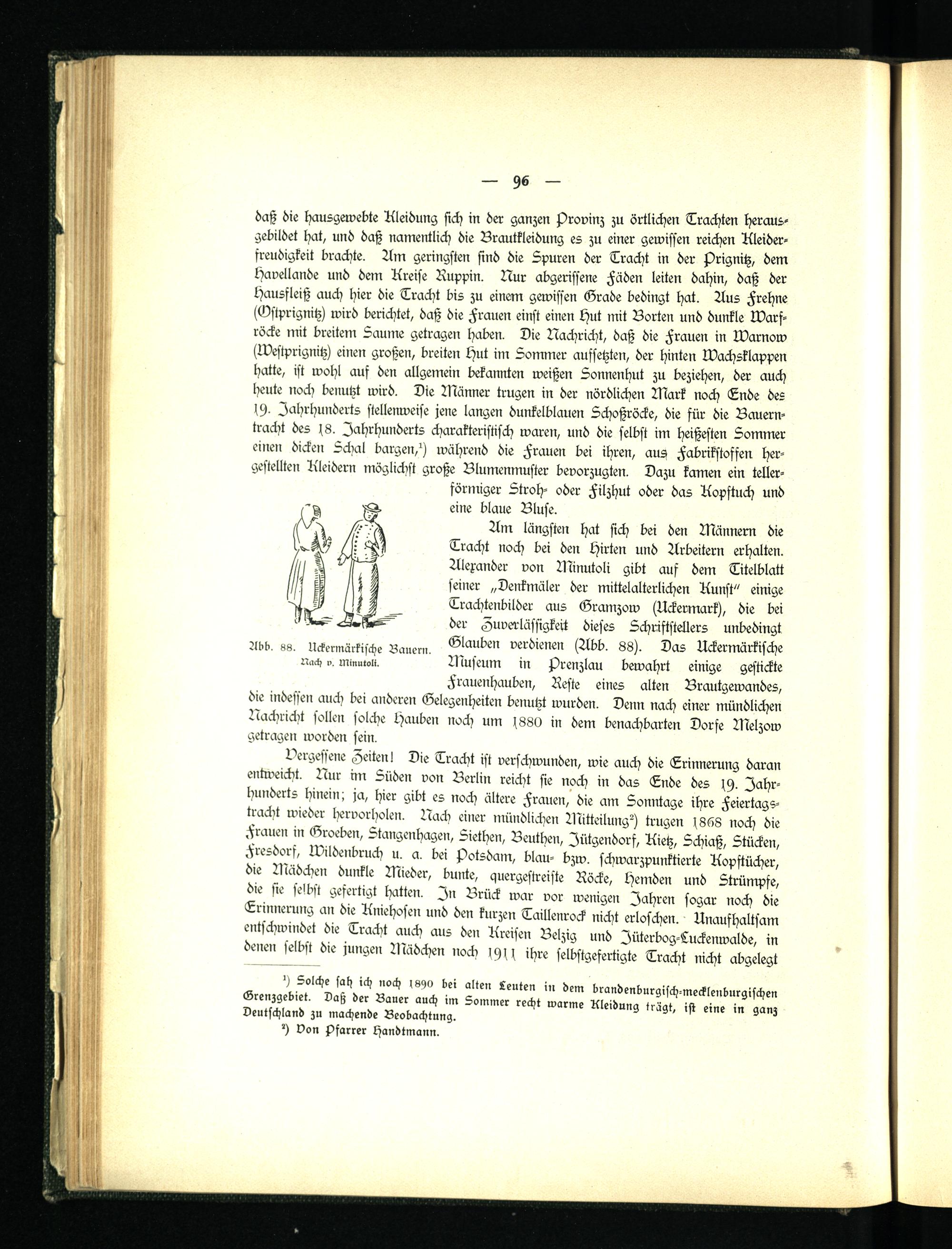 Am längsten hat sich bei den Männern die Tracht noch bei den Hirten und Arbeitern erhalten. Alexander von Minutoli gibt auf dem Titelblatt seiner „Denkmäler der mittelalterlichen Kunst" einige Trachtenbilder aus Gramzow (Uckermark), die bei der Zuverlässigkeit dieses Schriftstellers unbedingt Glauben verdienen (Abb. 88). Das Uckermärkische Museum in j/renzlau bewahrt einige gestickte Frauenhauben, Reste eines alten Brautgewandes, die indessen auch bei anderen Gelegenheiten benutzt wurden. Denn nach einer mündlichen Nachricht sollen solche Hauben noch um 1880 in dem benachbarten Dorfe Melzow getragen worden sein.