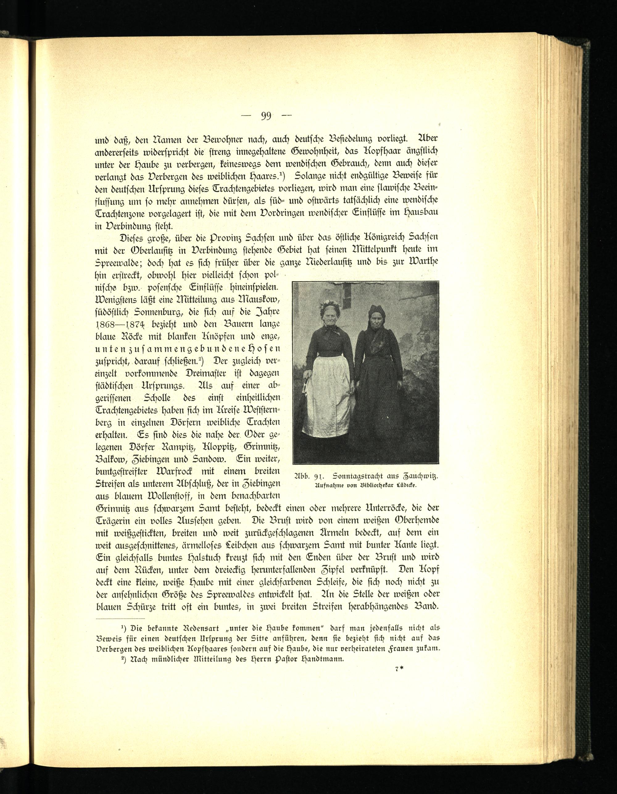 Wenigstens läßt eine Mitteilung aus Mauskow, südöstlich Sonnenburg, die sich auf die Jahre 1868—!874 bezieht und den Bauern lange blaue Röcke mit blanken Knöpfen und enge, unten zusammengebunden eHosen zuspricht, darauf schließen?) Der zugleich vereinzelt vorkommende Dreimaster ist dagegen städtischen Ursprungs. Als auf einer abgerissenen Scholle des einst einheitlichen Trachtengebietes haben sich im Kreise Weststernberg in einzelnen Dörfern weibliche Trachten erhalten. Es sind dies die nahe der Oder gelegenen Dörfer Rampitz, Kloppitz, Grimnitz,
