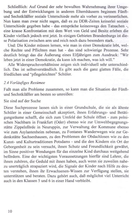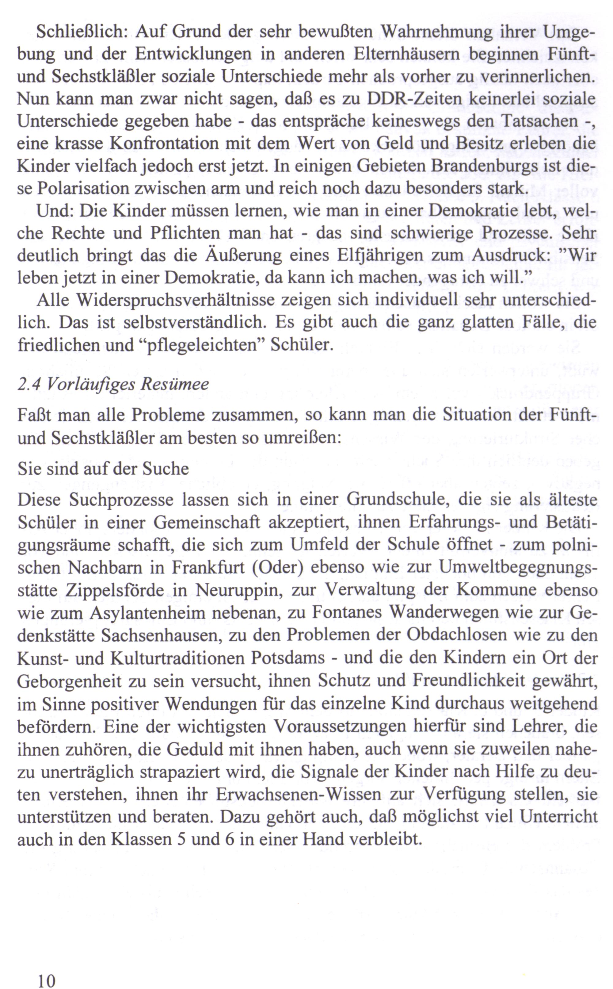 Diese Suchprozesse lassen sich in einer Grundschule, die sie als älteste Schüler in einer Gemeinschaft akzeptiert, ihnen Erfahrungs- und Betätigungsräume schafft, die sich zum Umfeld der Schule öffnet- zum polnischen Nachbarn in Frankfurt(Oder) ebenso wie zur Umweltbegegnungsstätte Zippelsförde in Neuruppin, zur Verwaltung der Kommune ebenso wie zum Asylantenheim nebenan, zu Fontanes Wanderwegen wie zur Gedenkstätte Sachsenhausen, zu den Problemen der Obdachlosen wie zu den Kunst- und Kulturtraditionen Potsdams- und die den Kindern ein Ort der Geborgenheit zu sein versucht, ihnen Schutz und Freundlichkeit gewährt, im Sinne positiver Wendungen für das einzelne Kind durchaus weitgehend befördern. Eine der wichtigsten Voraussetzungen hierfür sind Lehrer, die ihnen zuhören, die Geduld mit ihnen haben, auch wenn sie zuweilen nahezu unerträglich strapaziert wird, die Signale der Kinder nach Hilfe zu deuten verstehen, ihnen ihr Erwachsenen-Wissen zur Verfügung stellen, sie unterstützen und beraten. Dazu gehört auch, daß möglichst viel Unterricht auch in den Klassen 5 und 6 in einer Hand verbleibt.