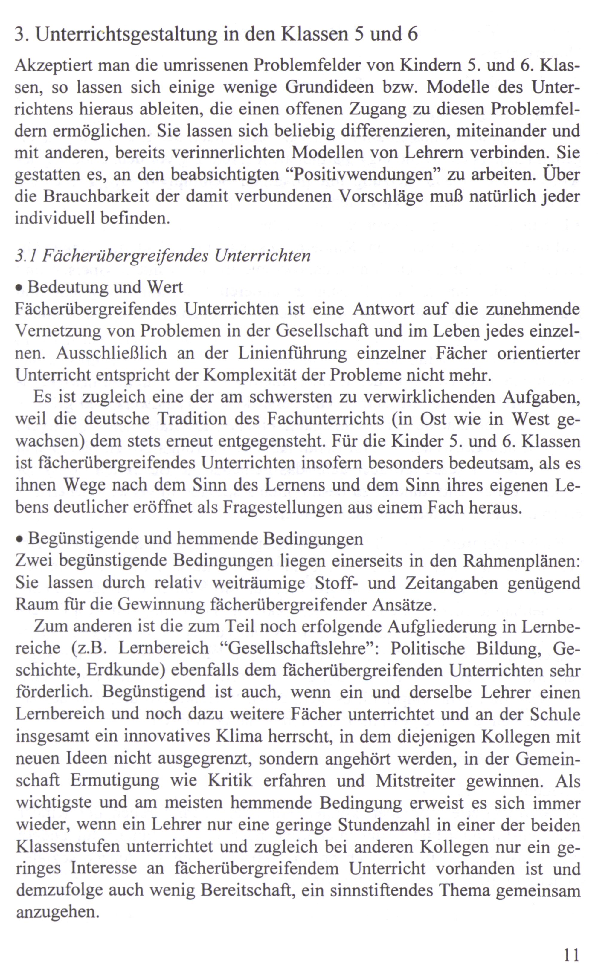 Es ist zugleich eine der am schwersten zu verwirklichenden Aufgaben, weil die deutsche Tradition des Fachunterrichts(in Ost wie in West gewachsen) dem stets erneut entgegensteht. Für die Kinder 5. und 6. Klassen ist fächerübergreifendes Unterrichten insofern besonders bedeutsam, als es ihnen Wege nach dem Sinn des Lernens und dem Sinn ihres eigenen Lebens deutlicher eröffnet als Fragestellungen aus einem Fach heraus.