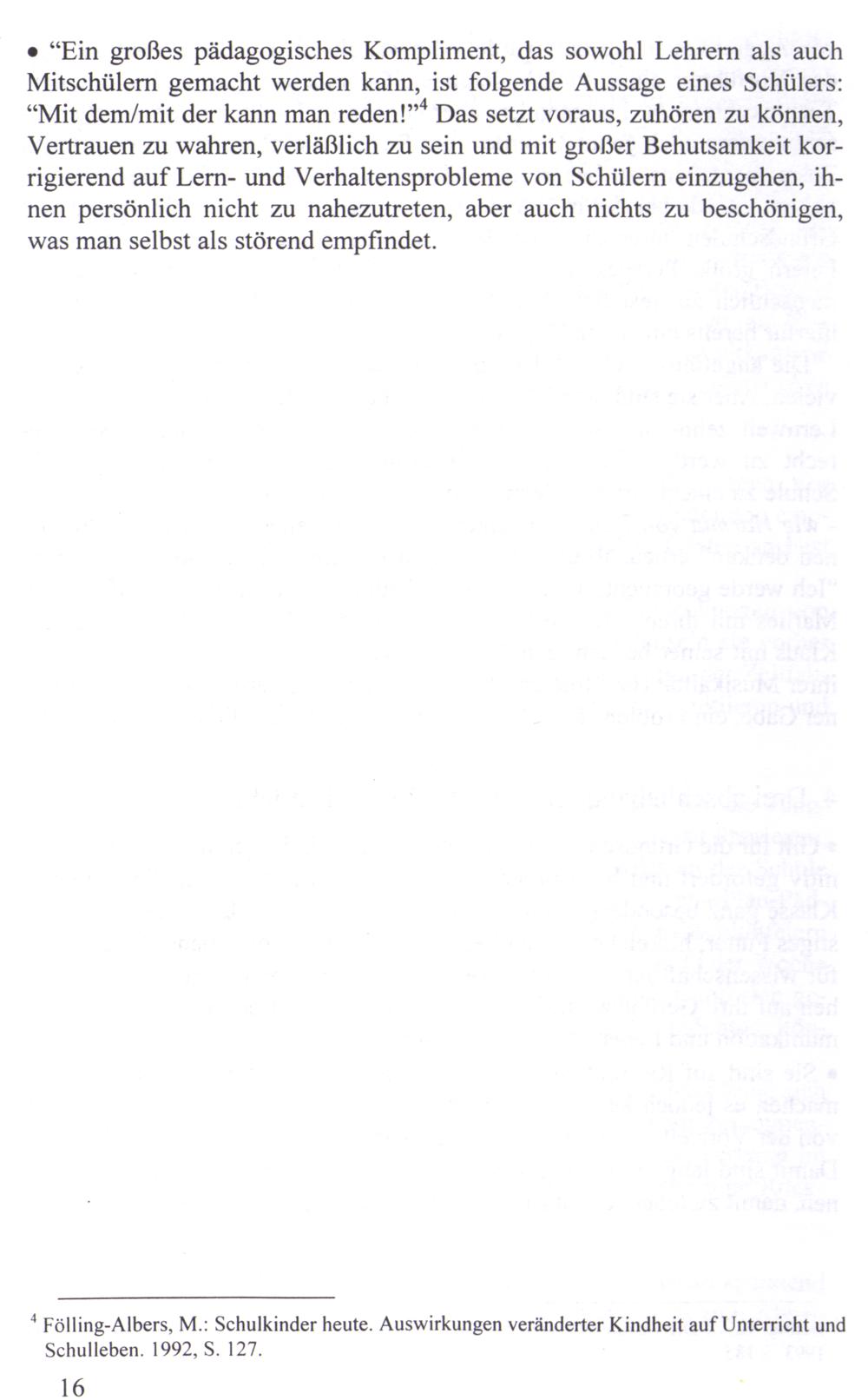 e“Ein großes pädagogisches Kompliment, das sowohl Lehrern als auch Mitschülern gemacht werden kann, ist folgende Aussage eines Schülers: “Mit dem/mit der kann man reden!”* Das setzt voraus, zuhören zu können, Vertrauen zu wahren, verläßlich zu sein und mit großer Behutsamkeit korrigierend auf Lern- und Verhaltensprobleme von Schülern einzugehen, ihnen persönlich nicht zu nahezutreten, aber auch nichts zu beschönigen, was man selbst als störend empfindet.