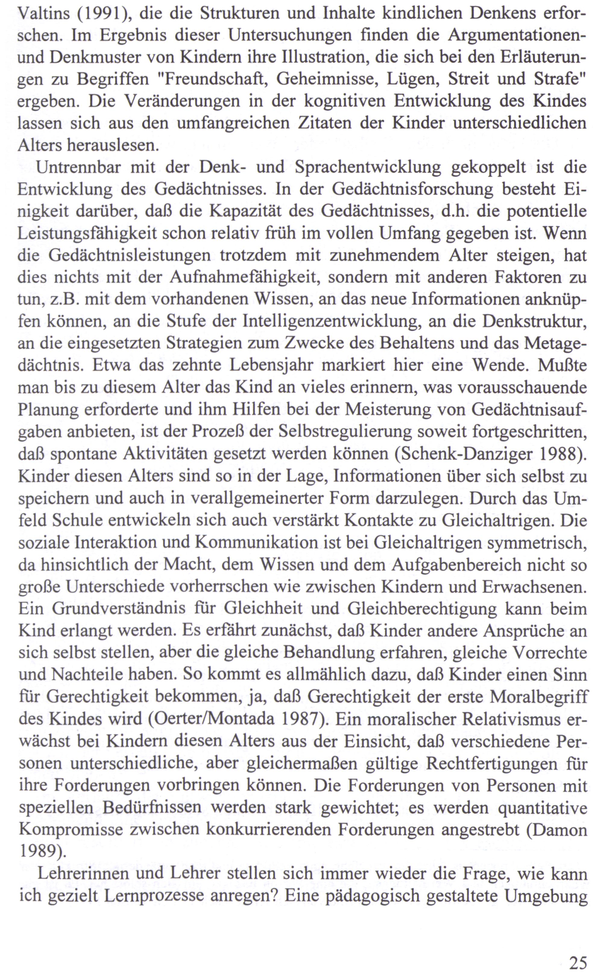 Untrennbar mit der Denk- und Sprachentwicklung gekoppelt ist die Entwicklung des Gedächtnisses. In der Gedächtnisforschung besteht Einigkeit darüber, daß die Kapazität des Gedächtnisses, d.h. die potentielle Leistungsfähigkeit schon relativ früh im vollen Umfang gegeben ist. Wenn die Gedächtnisleistungen trotzdem mit zunehmendem Alter steigen, hat dies nichts mit der Aufnahmefähigkeit, sondern mit anderen Faktoren zu tun, z.B. mit dem vorhandenen Wissen, an das neue Informationen anknüpfen können, an die Stufe der Intelligenzentwicklung, an die Denkstruktur, an die eingesetzten Strategien zum Zwecke des Behaltens und das Metagedächtnis. Etwa das zehnte Lebensjahr markiert hier eine Wende. Mußte man bis zu diesem Alter das Kind an vieles erinnern, was vorausschauende Planung erforderte und ihm Hilfen bei der Meisterung von Gedächtnisaufgaben anbieten, ist der Prozeß der Selbstregulierung soweit fortgeschritten, daß spontane Aktivitäten gesetzt werden können(Schenk-Danziger 1988). Kinder diesen Alters sind so in der Lage, Informationen über sich selbst zu speichern und auch in verallgemeinerter Form darzulegen. Durch das Umfeld Schule entwickeln sich auch verstärkt Kontakte zu Gleichaltrigen. Die soziale Interaktion und Kommunikation ist bei Gleichaltrigen symmetrisch, da hinsichtlich der Macht, dem Wissen und dem Aufgabenbereich nicht so große Unterschiede vorherrschen wie zwischen Kindern und Erwachsenen. Ein Grundverständnis für Gleichheit und Gleichberechtigung kann beim Kind erlangt werden. Es erfährt zunächst, daß Kinder andere Ansprüche an sich selbst stellen, aber die gleiche Behandlung erfahren, gleiche Vorrechte und Nachteile haben. So kommt es allmählich dazu, daß Kinder einen Sinn für Gerechtigkeit bekommen, ja, daß Gerechtigkeit der erste Moralbegriff des Kindes wird(Oerter/Montada 1987). Ein moralischer Relativismus erwächst bei Kindern diesen Alters aus der Einsicht, daß verschiedene Personen unterschiedliche, aber gleichermaßen gültige Rechtfertigungen für ihre Forderungen vorbringen können. Die Forderungen von Personen mit speziellen Bedürfnissen werden stark gewichtet; es werden quantitative Kompromisse zwischen konkurrierenden Forderungen angestrebt(Damon 1989).