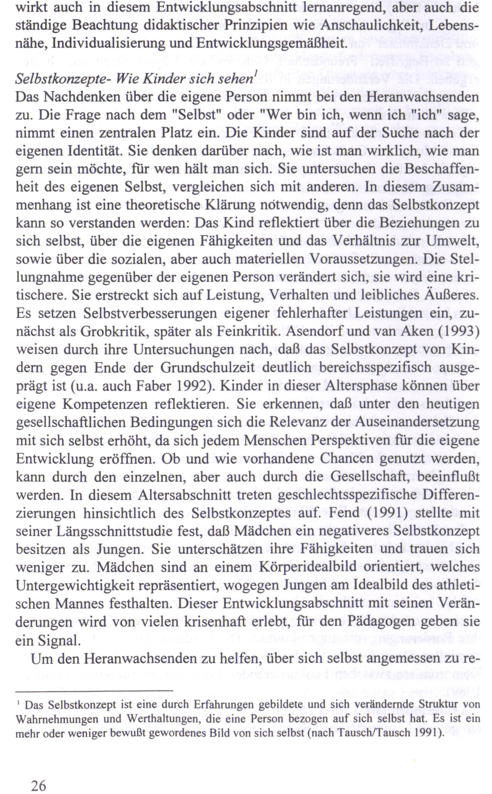 Selbstkonzepte- Wie Kinder sich sehen‘ Das Nachdenken über die eigene Person nimmt bei den Heranwachsenden zu. Die Frage nach dem"Selbst" oder"Wer bin ich, wenn ich"ich" sage, nimmt einen zentralen Platz ein. Die Kinder sind auf der Suche nach der eigenen Identität. Sie denken darüber nach, wie ist man wirklich, wie man gern sein möchte, für wen hält man sich. Sie untersuchen die Beschaffenheit des eigenen Selbst, vergleichen sich mit anderen. In diesem Zusammenhang ist eine theoretische Klärung notwendig, denn das Selbstkonzept kann so verstanden werden: Das Kind reflektiert über die Beziehungen zu sich selbst, über die eigenen Fähigkeiten und das Verhältnis zur Umwelt, sowie über die sozialen, aber auch materiellen Voraussetzungen. Die Stellungnahme gegenüber der eigenen Person verändert sich, sie wird eine kritischere. Sie erstreckt sich auf Leistung, Verhalten und leibliches Äußeres. Es setzen Selbstverbesserungen eigener fehlerhafter Leistungen ein, zunächst als Grobkritik, später als Feinkritik. Asendorf und van Aken(1993) weisen durch ihre Untersuchungen nach, daß das Selbstkonzept von Kindern gegen Ende der Grundschulzeit deutlich bereichsspezifisch ausgeprägt ist(u.a. auch Faber 1992). Kinder in dieser Altersphase können über eigene Kompetenzen reflektieren. Sie erkennen, daß unter den heutigen gesellschaftlichen Bedingungen sich die Relevanz der Auseinandersetzung mit sich selbst erhöht, da sich jedem Menschen Perspektiven für die eigene Entwicklung eröffnen. Ob und wie vorhandene Chancen genutzt werden, kann durch den einzelnen, aber auch durch die Gesellschaft, beeinflußt werden. In diesem Altersabschnitt treten geschlechtsspezifische Differenzierungen hinsichtlich des Selbstkonzeptes auf. Fend(1991) stellte mit seiner Längsschnittstudie fest, daß Mädchen ein negativeres Selbstkonzept besitzen als Jungen. Sie unterschätzen ihre Fähigkeiten und trauen sich weniger zu. Mädchen sind an einem Körperidealbild orientiert, welches Untergewichtigkeit repräsentiert, wogegen Jungen am Idealbild des athletischen Mannes festhalten. Dieser Entwicklungsabschnitt mit seinen Veränderungen wird von vielen krisenhaft erlebt, für den Pädagogen geben sie ein Signal.