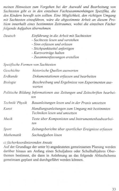 meinen Hinweisen zum Vorgehen bei der Auswahl und Bearbeitung von Sachtexten gibt es in den einzelnen Fachzusammenhängen Spezifika, die den Kindern bewußt sein sollten. Eine Möglichkeit, den richtigen Umgang mit Sachtexten einzuführen, wäre die abgestimmte Arbeit an diesem Problem innerhalb eines bestimmten Zeitraumes, wobei die einzelnen Fächer folgende Aufgaben übernehmen.