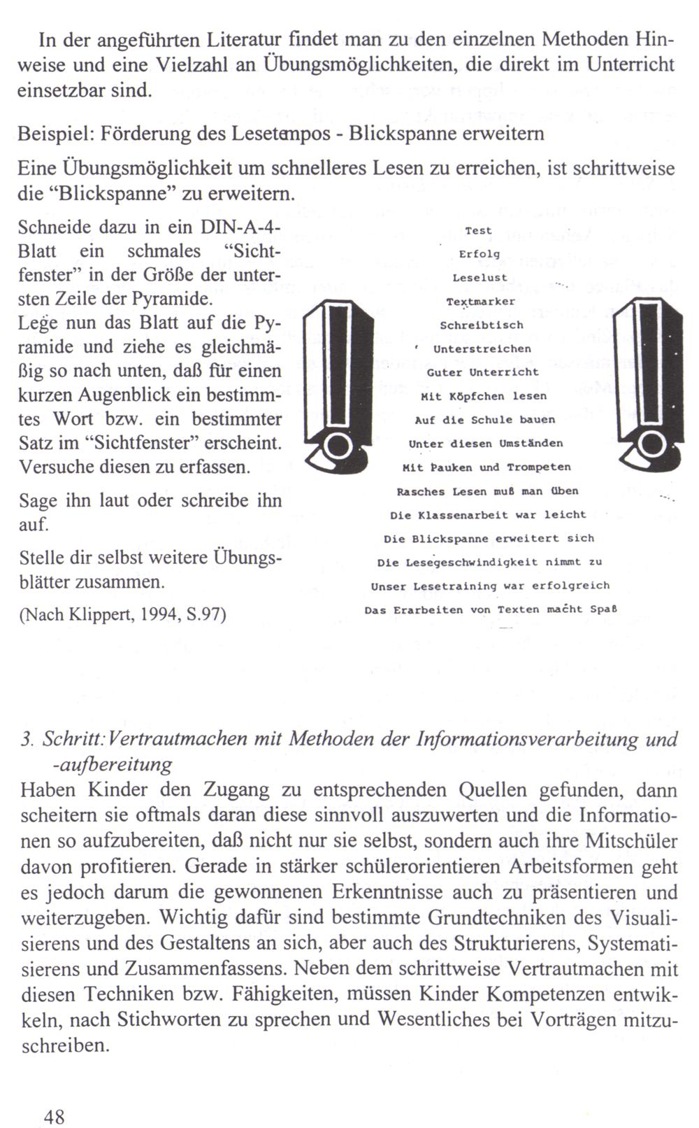 In der angeführten Literatur findet man zu den einzelnen Methoden Hinweise und eine Vielzahl an Ubungsmöglichkeiten, die direkt im Unterricht