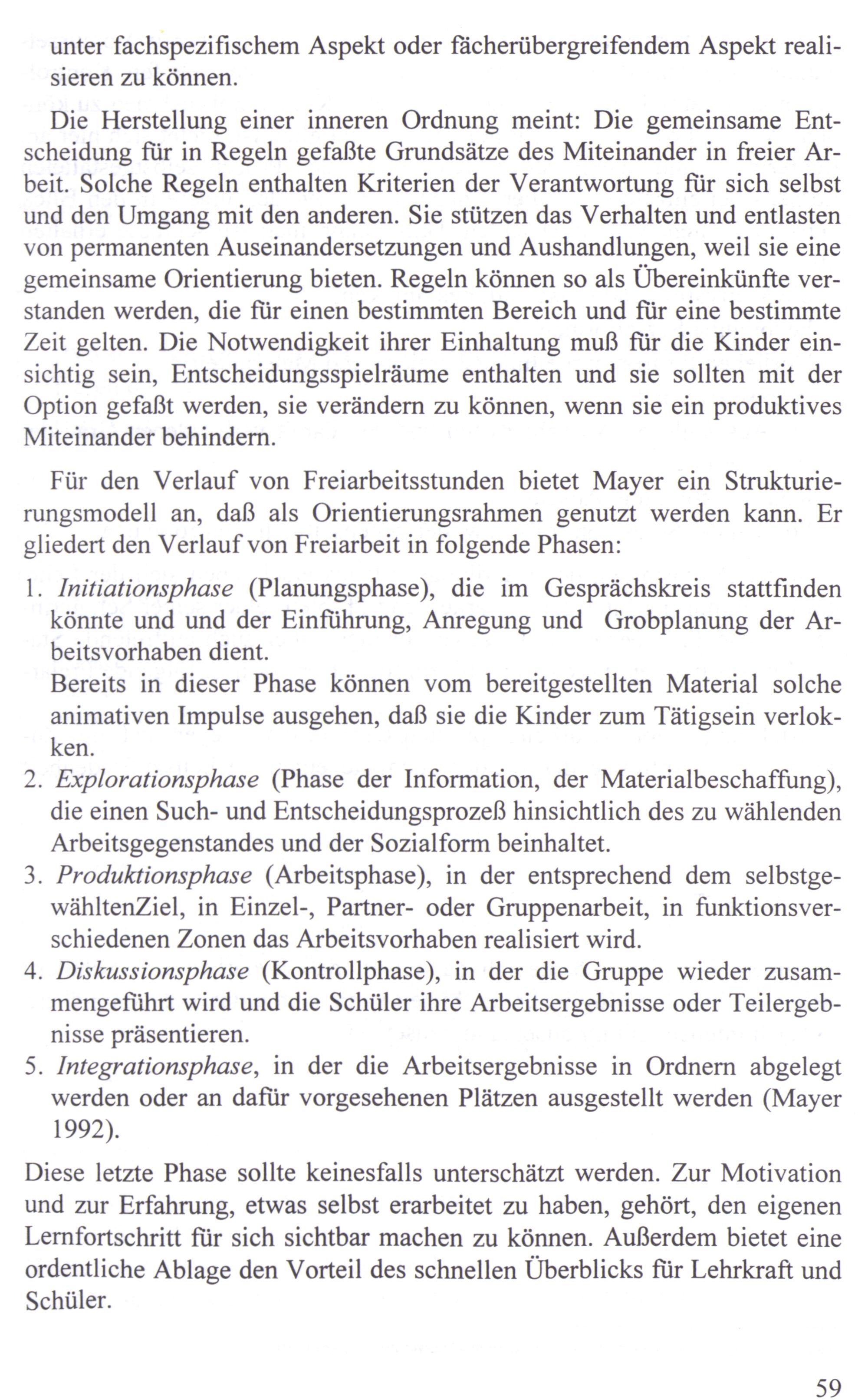 Für den Verlauf von Freiarbeitsstunden bietet Mayer ein Strukturierungsmodell an, daß als Orientierungsrahmen genutzt werden kann. Er gliedert den Verlauf von Freiarbeit in folgende Phasen: