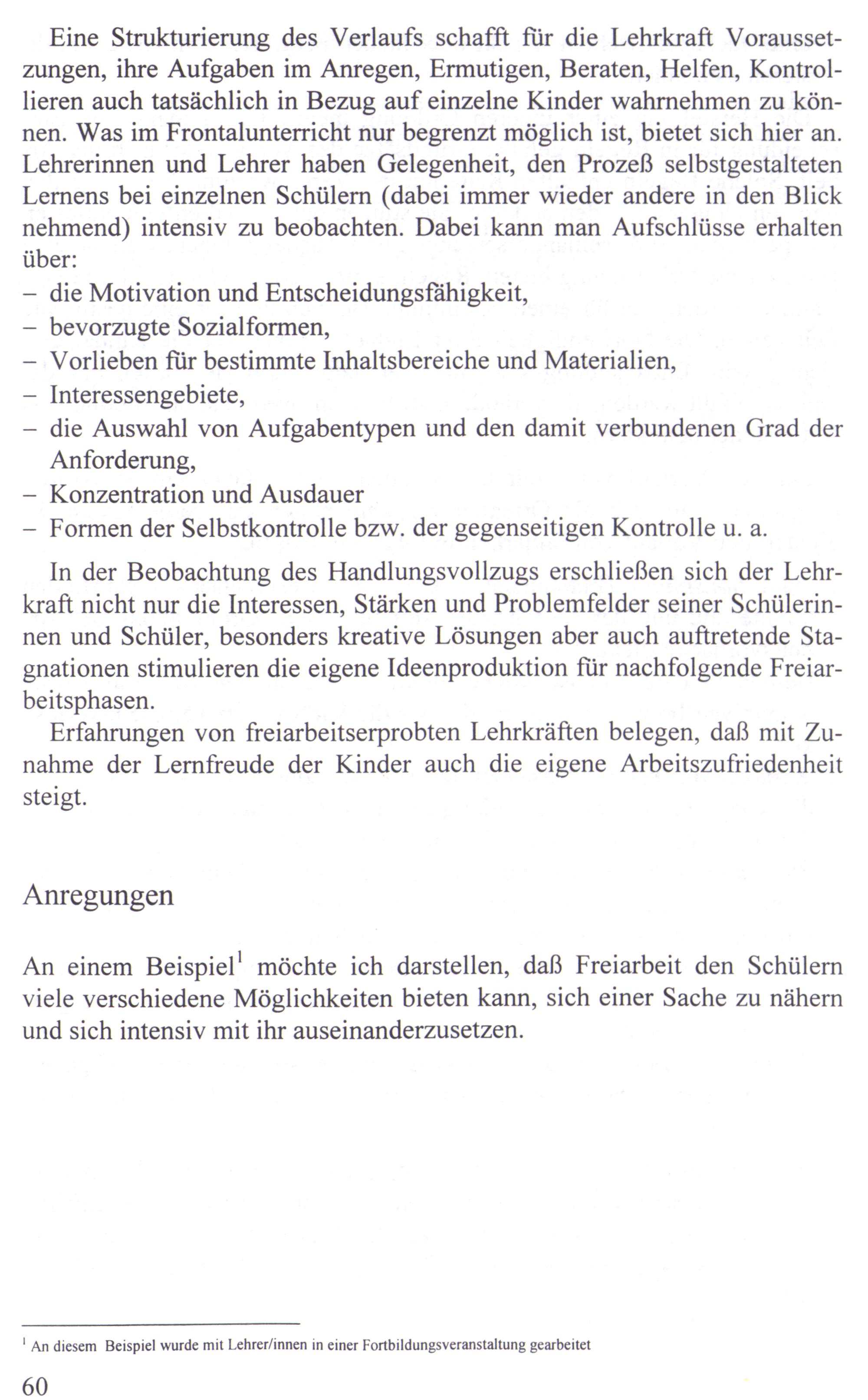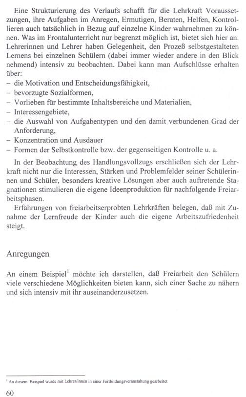 Eine Strukturierung des Verlaufs schafft für die Lehrkraft Voraussetzungen, ihre Aufgaben im Anregen, Ermutigen, Beraten, Helfen, Kontrollieren auch tatsächlich in Bezug auf einzelne Kinder wahrnehmen zu können. Was im Frontalunterricht nur begrenzt möglich ist, bietet sich hier an. Lehrerinnen und Lehrer haben Gelegenheit, den Prozeß selbstgestalteten Lernens bei einzelnen Schülern(dabei immer wieder andere in den Blick nehmend) intensiv zu beobachten. Dabei kann man Aufschlüsse erhalten über:
