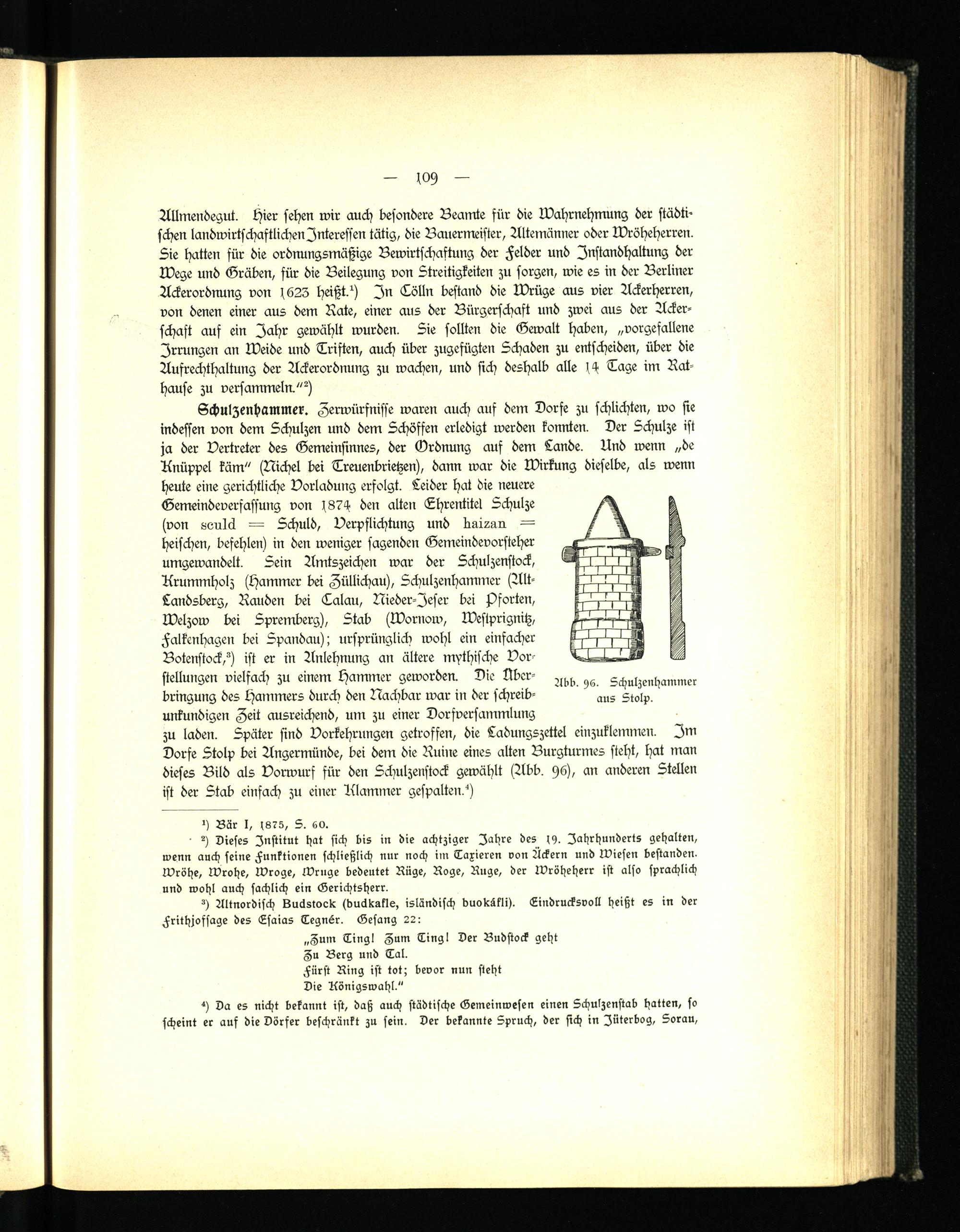 9 Da es nicht bekannt ist, daß auch städtische Gemeinwesen einen Schulzenstab hatten, so scheint er auf die Dörfer beschränkt zu sein. Der bekannte Spruch, der sich in Jüterbog, Sorau,