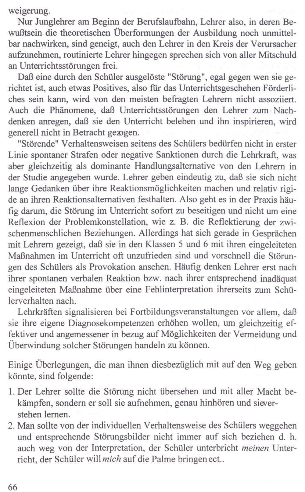 Nur Junglehrer am Beginn der Berufslaufbahn, Lehrer also, in deren Bewußtsein die theoretischen Überformungen der Ausbildung noch unmittelbar nachwirken, sind geneigt, auch den Lehrer in den Kreis der Verursacher aufzunehmen, routinierte Lehrer hingegen sprechen sich von aller Mitschuld an Unterrichtsstörungen frei.