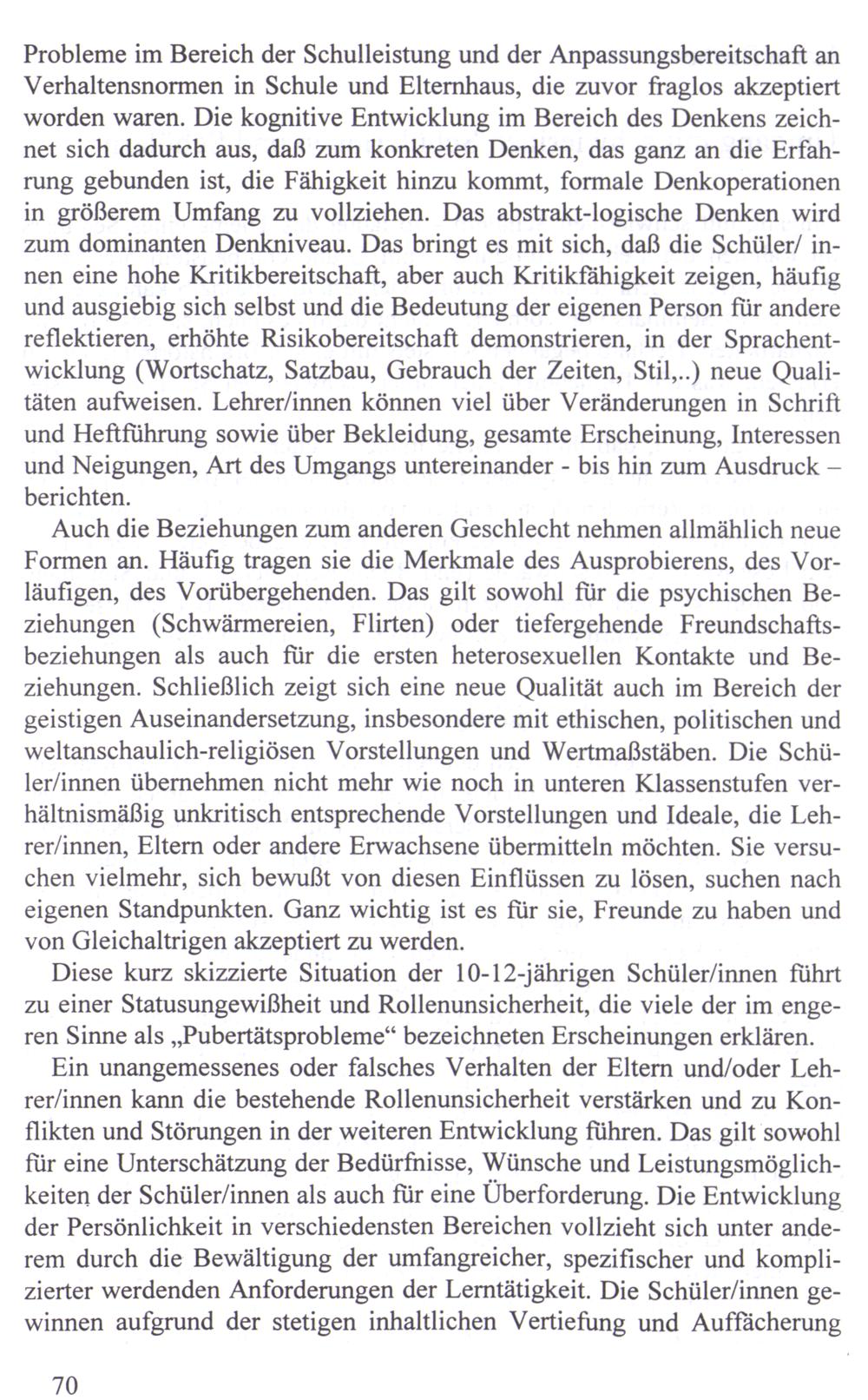 Probleme im Bereich der Schulleistung und der Anpassungsbereitschaft an Verhaltensnormen in Schule und Elternhaus, die zuvor fraglos akzeptiert worden waren. Die kognitive Entwicklung im Bereich des Denkens zeichnet sich dadurch aus, daß zum konkreten Denken, das ganz an die Erfahrung gebunden ist, die Fähigkeit hinzu kommt, formale Denkoperationen in größerem Umfang zu vollziehen. Das abstrakt-logische Denken wird zum dominanten Denkniveau. Das bringt es mit sich, daß die Schüler/ innen eine hohe Kritikbereitschaft, aber auch Kritikfähigkeit zeigen, häufig und ausgiebig sich selbst und die Bedeutung der eigenen Person für andere reflektieren, erhöhte Risikobereitschaft demonstrieren, in der Sprachentwicklung(Wortschatz, Satzbau, Gebrauch der Zeiten, Stil,..) neue Qualitäten aufweisen. Lehrer/innen können viel über Veränderungen in Schrift und Heftführung sowie über Bekleidung, gesamte Erscheinung, Interessen und Neigungen, Art des Umgangs untereinander- bis hin zum Ausdruck— berichten.