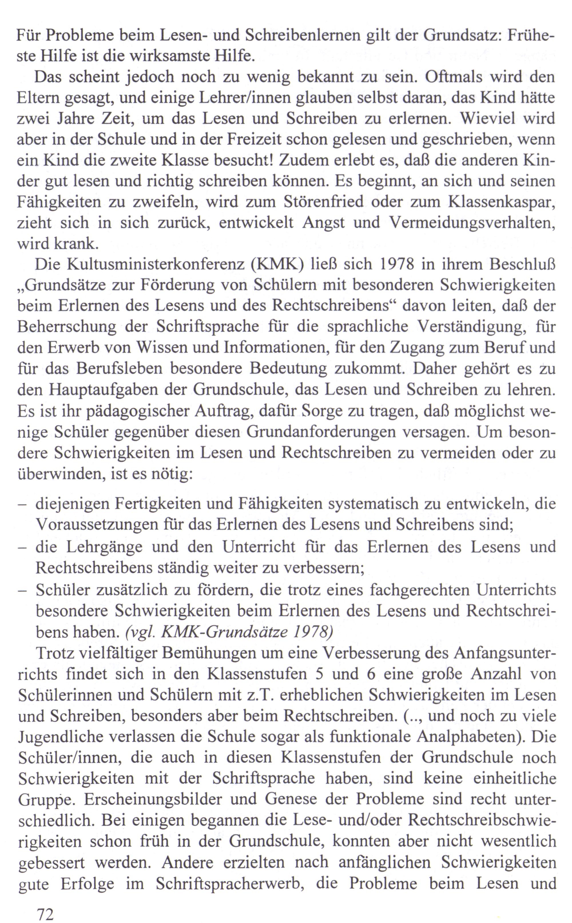 Die Kultusministerkonferenz(KMK) ließ sich 1978 in ihrem Beschluß „Grundsätze zur Förderung von Schülern mit besonderen Schwierigkeiten beim Erlernen des Lesens und des Rechtschreibens‘“ davon leiten, daß der Beherrschung der Schriftsprache für die sprachliche Verständigung, für den Erwerb von Wissen und Informationen, für den Zugang zum Beruf und für das Berufsleben besondere Bedeutung zukommt. Daher gehört es zu den Hauptaufgaben der Grundschule, das Lesen und Schreiben zu lehren. Es ist ihr pädagogischer Auftrag, dafür Sorge zu tragen, daß möglichst wenige Schüler gegenüber diesen Grundanforderungen versagen. Um besondere Schwierigkeiten im Lesen und Rechtschreiben zu vermeiden oder zu überwinden, ist es nötig:
