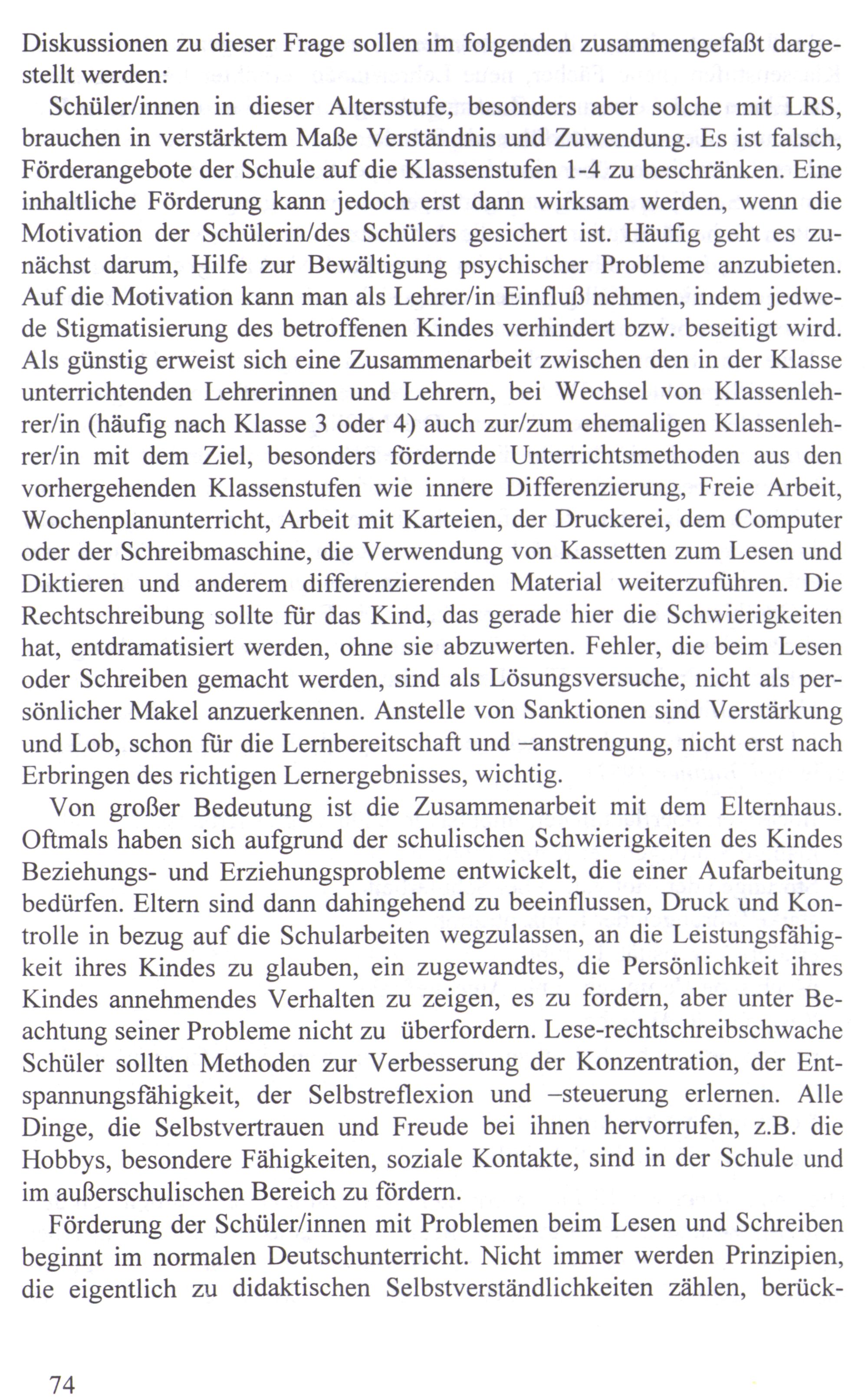 Schüler/innen in dieser Altersstufe, besonders aber solche mit LRS, brauchen in verstärktem Maße Verständnis und Zuwendung. Es ist falsch, Förderangebote der Schule auf die Klassenstufen 1-4 zu beschränken. Eine inhaltliche Förderung kann jedoch erst dann wirksam werden, wenn die Motivation der Schülerin/des Schülers gesichert ist. Häufig geht es zunächst darum, Hilfe zur Bewältigung psychischer Probleme anzubieten. Auf die Motivation kann man als Lehrer/in Einfluß nehmen, indem jedwede Stigmatisierung des betroffenen Kindes verhindert bzw. beseitigt wird. Als günstig erweist sich eine Zusammenarbeit zwischen den in der Klasse unterrichtenden Lehrerinnen und Lehrern, bei Wechsel von Klassenlehrer/in(häufig nach Klasse 3 oder 4) auch zur/zum ehemaligen Klassenlehrer/in mit dem Ziel, besonders fördernde Unterrichtsmethoden aus den vorhergehenden Klassenstufen wie innere Differenzierung, Freie Arbeit, Wochenplanunterricht, Arbeit mit Karteien, der Druckerei, dem Computer oder der Schreibmaschine, die Verwendung von Kassetten zum Lesen und Diktieren und anderem differenzierenden Material weiterzuführen. Die Rechtschreibung sollte für das Kind, das gerade hier die Schwierigkeiten hat, entdramatisiert werden, ohne sie abzuwerten. Fehler, die beim Lesen oder Schreiben gemacht werden, sind als Lösungsversuche, nicht als persönlicher Makel anzuerkennen. Anstelle von Sanktionen sind Verstärkung und Lob, schon für die Lernbereitschaft und—-anstrengung, nicht erst nach Erbringen des richtigen Lernergebnisses, wichtig.