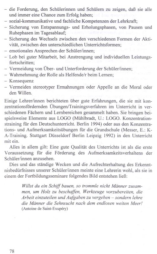 Einige Lehrer/innen berichteten über gute Erfahrungen, die sie mit konzentrationsfördernden Übungen/Trainingsverfahren im Unterricht in verschiedenen Fächern und Lernbereichen gesammelt haben. Sie bringen beispielsweise Elemente aus LOGO(Mühlbradt, U.: LOGO. Konzentrationstraining für den Deutschunterricht. Berlin 1994) oder aus den Konzentrations- und Aufmerksamkeitsübungen für die Grundschule(Messer, E.: KA-Training. Stuttgart Düsseldorf Berlin Leipzig 1992) in den Unterricht mit ein.