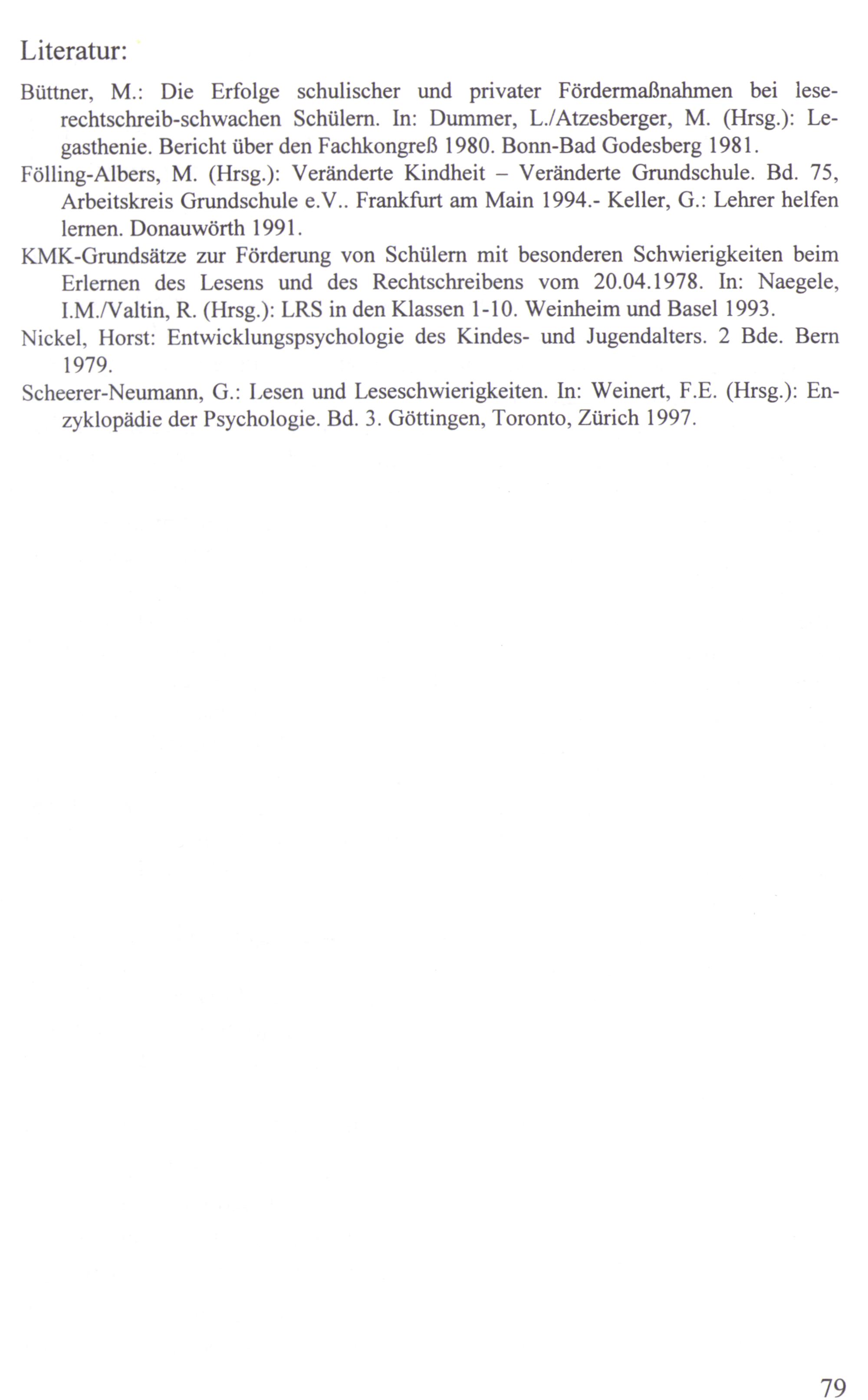 Büttner, M.: Die Erfolge schulischer und privater Fördermaßnahmen bei leserechtschreib-schwachen Schülern. In: Dummer, L./Atzesberger, M.(Hrsg.): Legasthenie. Bericht über den Fachkongreß 1980. Bonn-Bad Godesberg 1981.