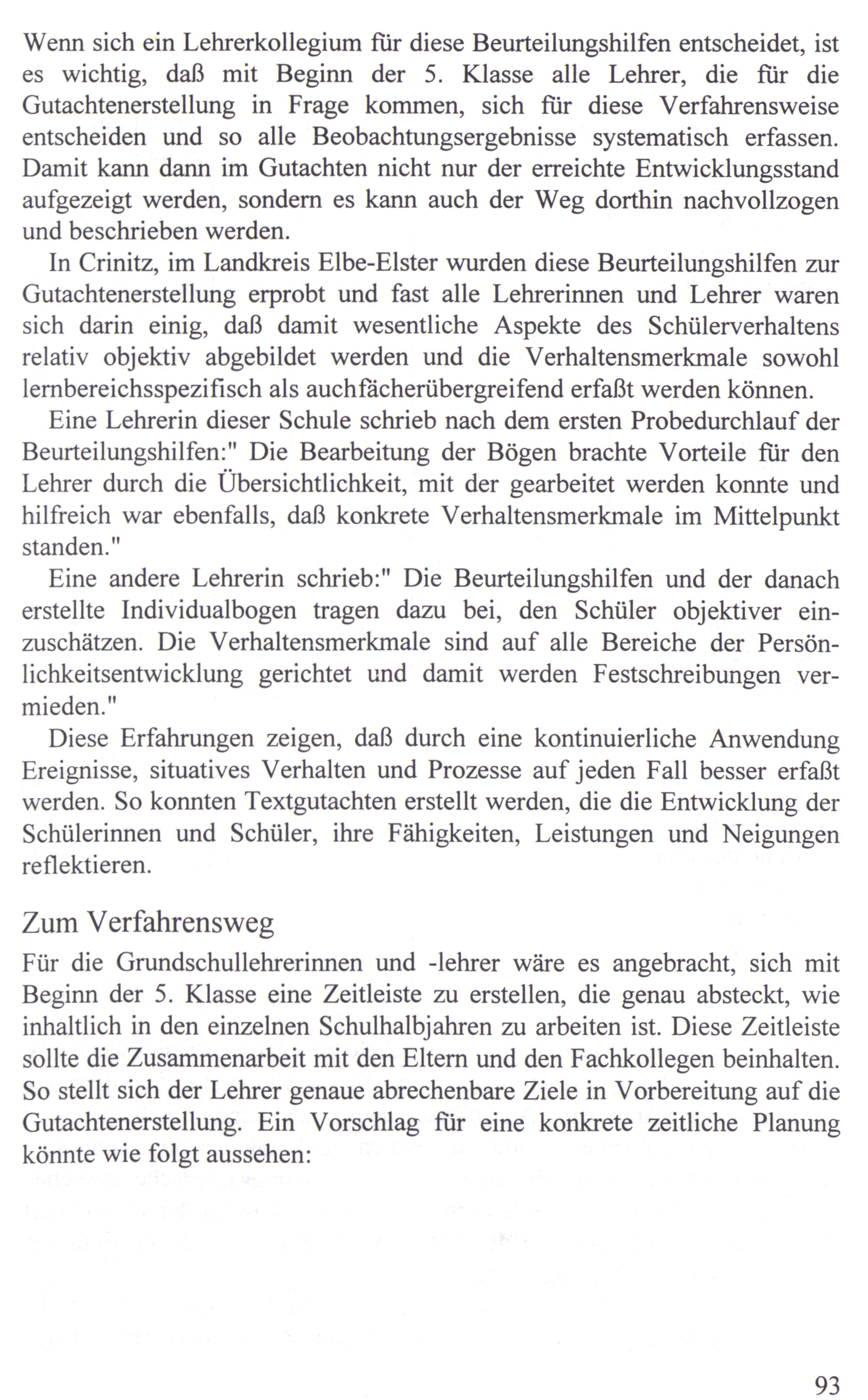 In Crinitz, im Landkreis Elbe-Elster wurden diese Beurteilungshilfen zur Gutachtenerstellung erprobt und fast alle Lehrerinnen und Lehrer waren sich darin einig, daß damit wesentliche Aspekte des Schülerverhaltens relativ objektiv abgebildet werden und die Verhaltensmerkmale sowohl lernbereichsspezifisch als auchfächerübergreifend erfaßt werden können.